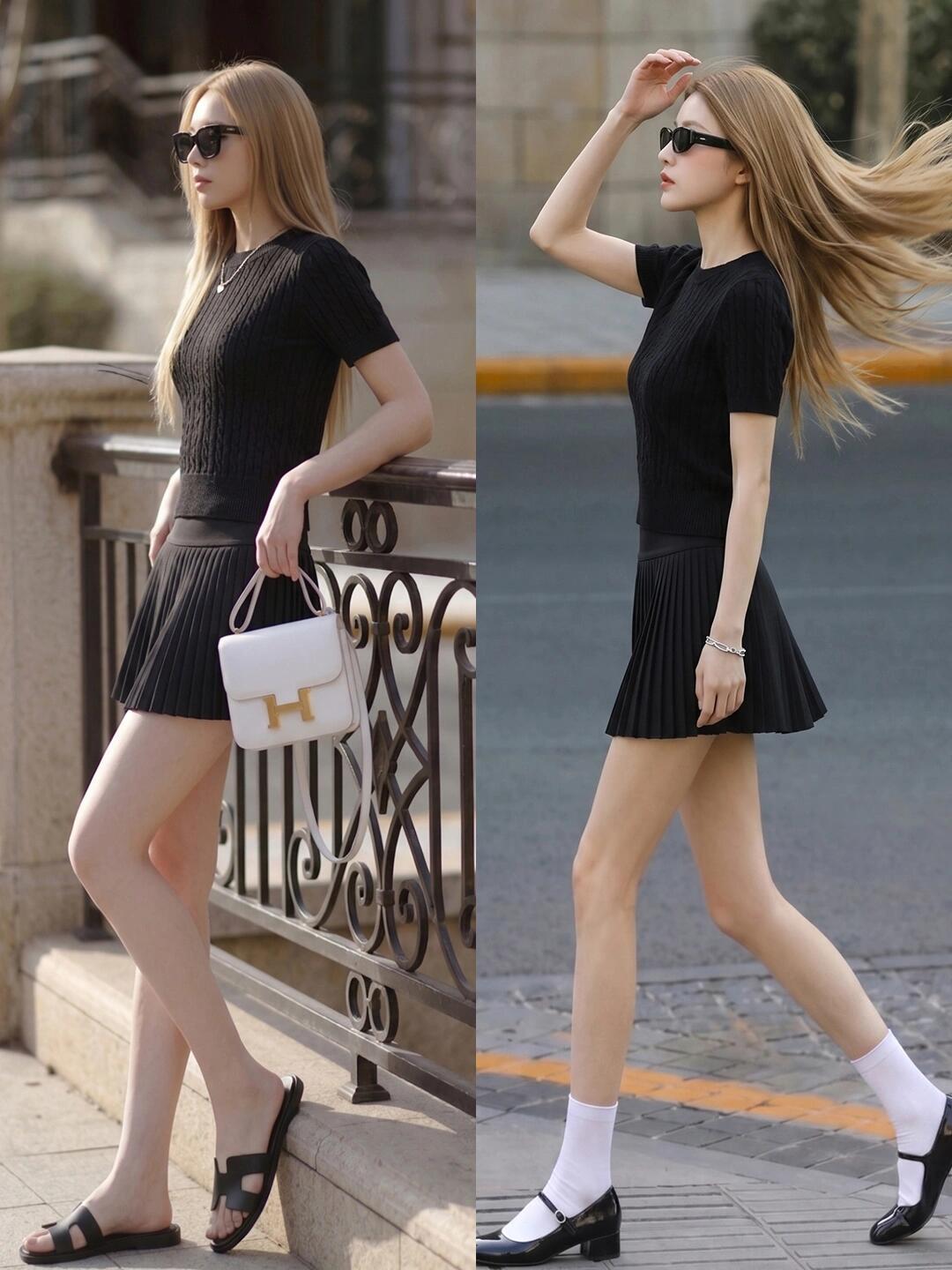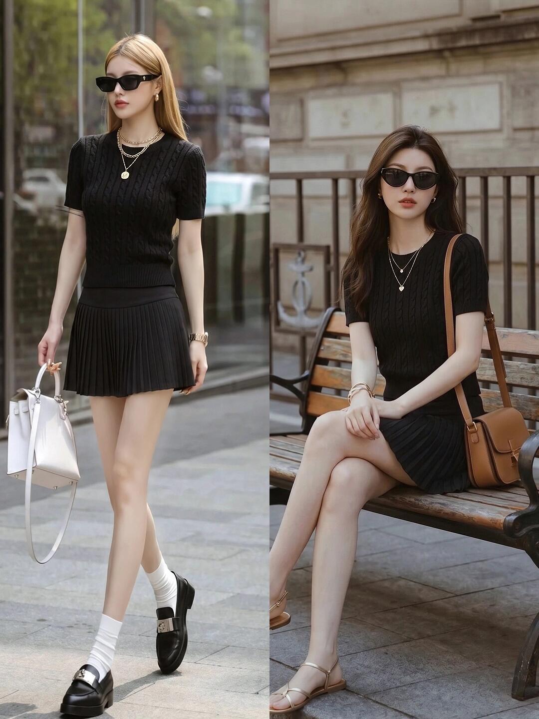 极简黑T或针织衫自带利落质感,搭配卡其阔腿裤松弛又显瘦,不费力就穿出都市通勤感。换一身黑色麻花针织衫搭百褶短裙,秒变利落甜酷风,搭配玛丽珍鞋或乐福鞋,又美又飒。这几组搭配用基础单品玩转不同风格,低调耐看又充满高级感,日常通勤或出街都很合适。