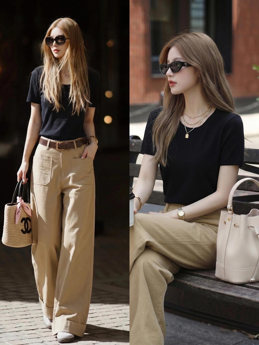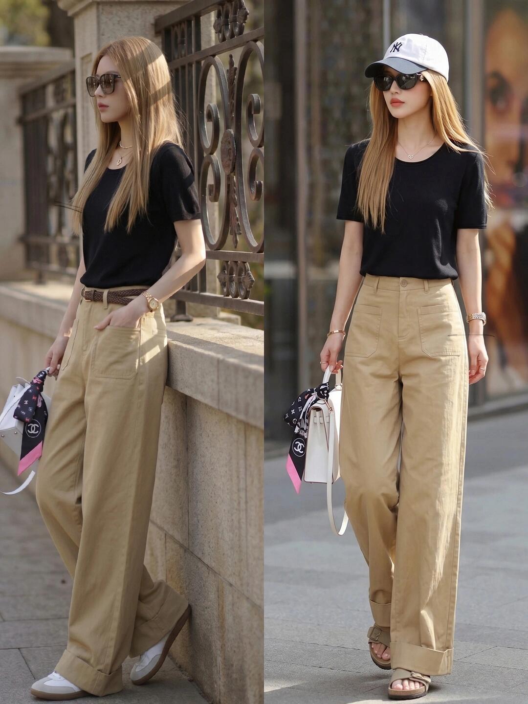 黑色配卡其很高级啊! 极简黑T或针织衫自带利落质感,搭配卡其阔腿裤松弛又显瘦,不
