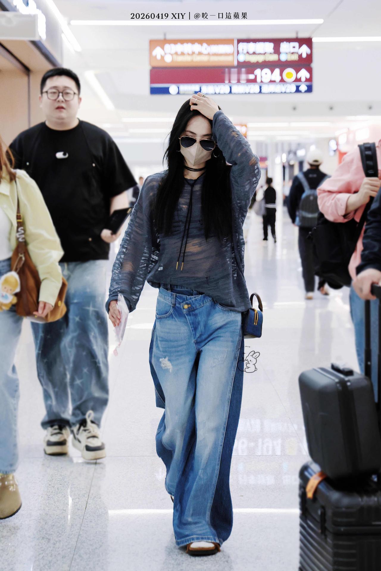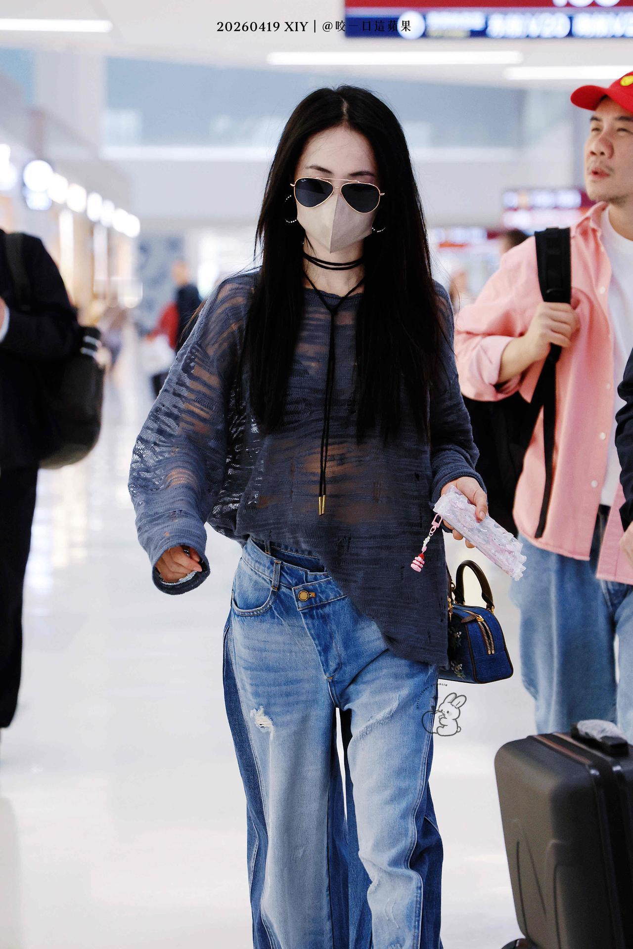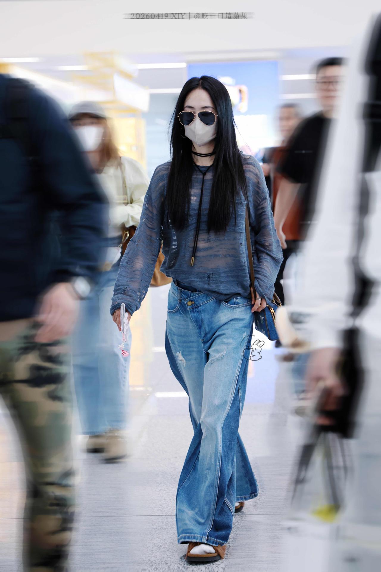蔡依林私服超适合小个子,显高洋气! 灰蓝色破洞针织衫搭配高腰阔腿牛仔裤,巧妙拉高
