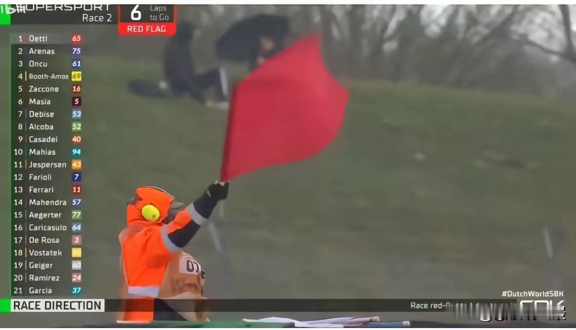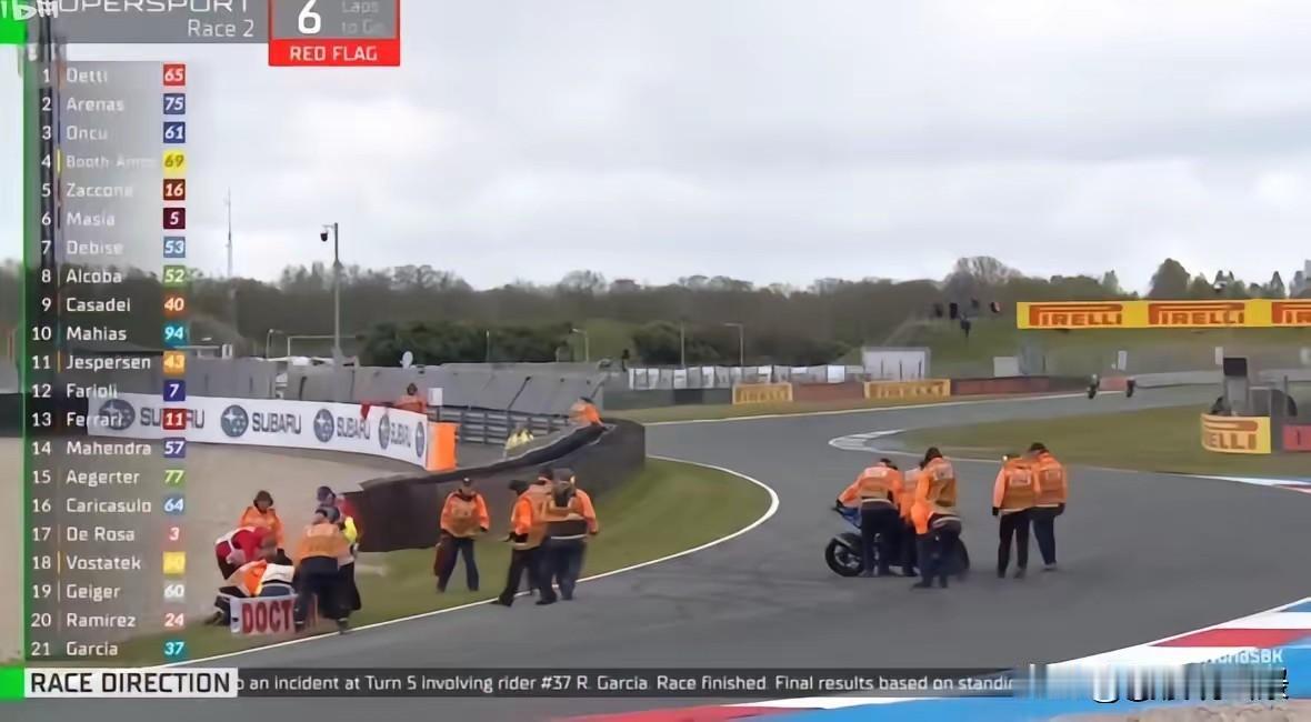第二场,在53号持续发力,稳步提高之时,车手加西亚在5号弯失控摔车赛车破损大量漏油,赛道湿滑、有安全隐患,赛道被事故车部分堵塞下,无法安全继续比赛。而车手也需要医疗救援,因此红旗停赛也合情合理。