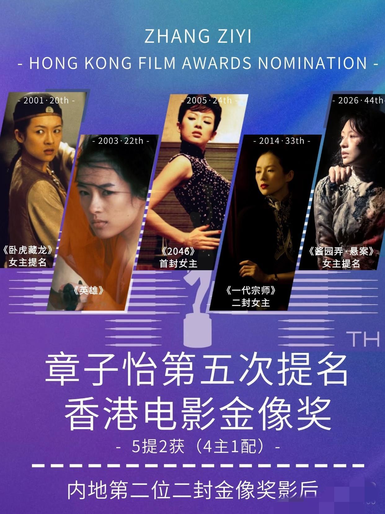 备注: 章子怡曾凭借电影《2046》(2005年)和《一代宗师》(2014年)两度摘得金像奖影后。