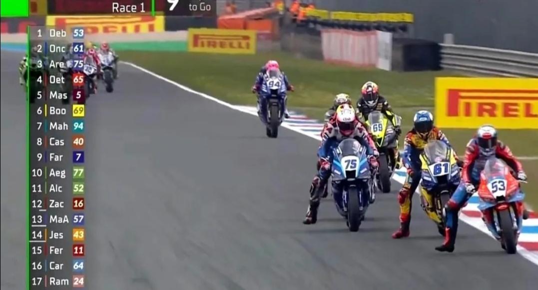 最后一圈,德比斯紧咬牙关。前面五台雅马哈,四台杜卡迪,像堵墙一样死死卡住线路。他们不是一个人,而是一群狼。而德比斯,只有一辆车,一台张雪机车。