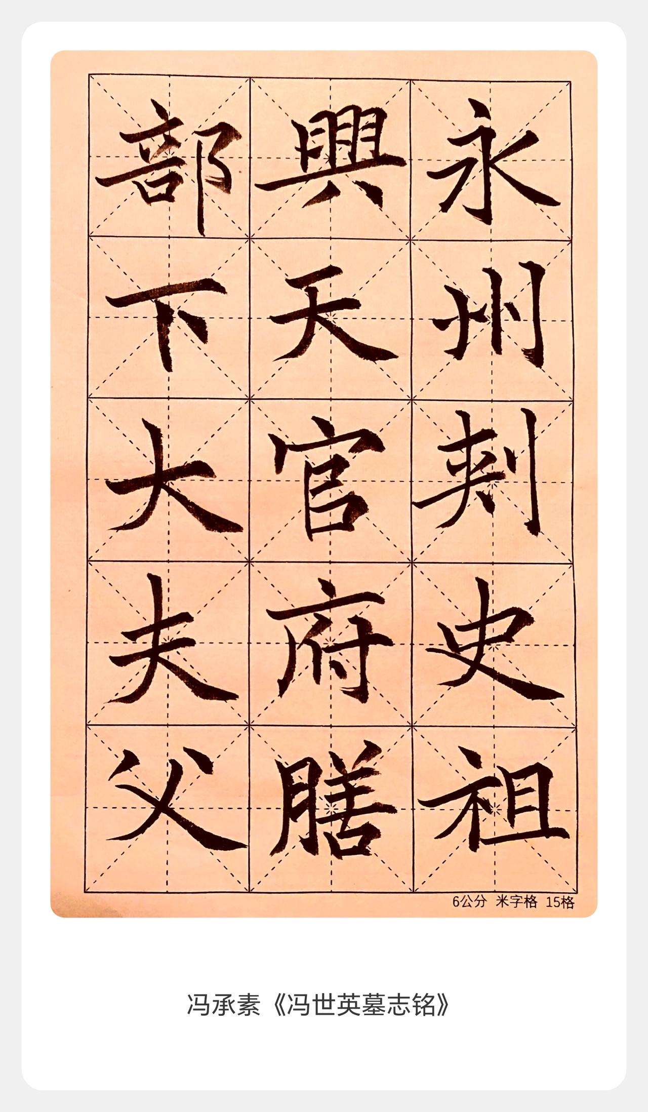 冯承素以双钩摹《兰亭序》闻名,传世墓志楷书灵动秀润,兼具晋唐风韵。这幅临作能抓住其笔法灵动、结体疏朗的特点,笔势流畅不僵,体现出了墓志本身清雅的气韵,若能强化提按变化,会更有层次感。