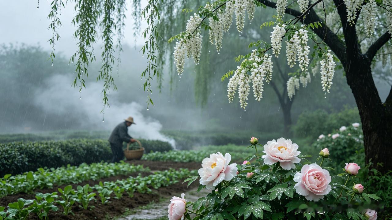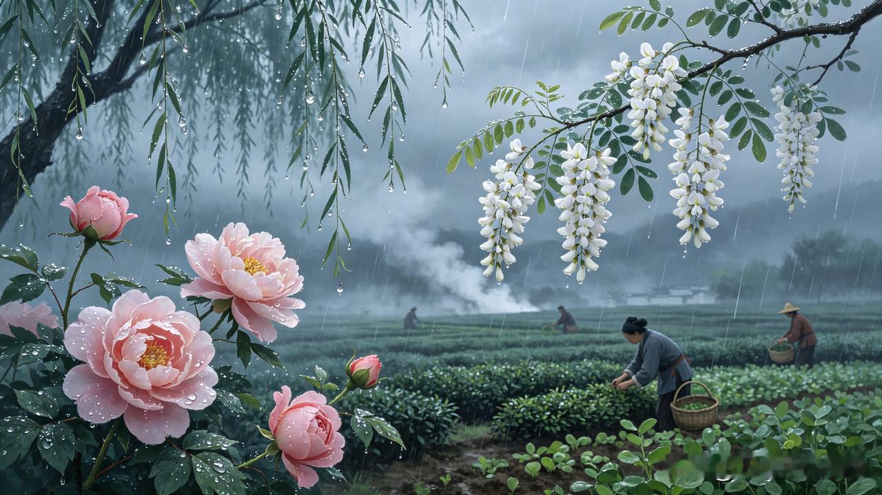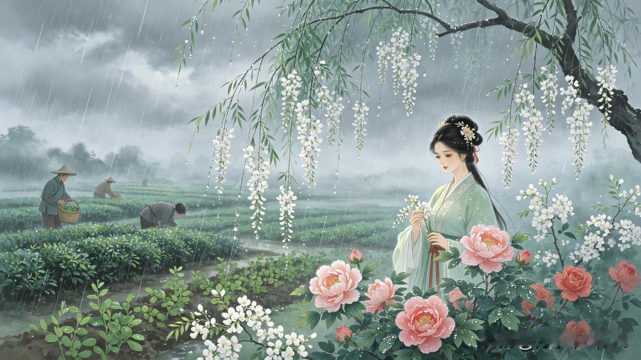 谷雨谣 今逢谷雨气萧森 昨夜甘霖打柳裙 流苏含情带清露 牡丹衔珠意动人 烟半散,天半阴 采茶种豆正暮春 朵朵月季似佳丽 串串槐花拒沾尘 注:气萧森,昨夜降了一场雨,今日谷雨气温陡降了七八度,清早起来,感觉春寒料峭一般,很是阴冷。