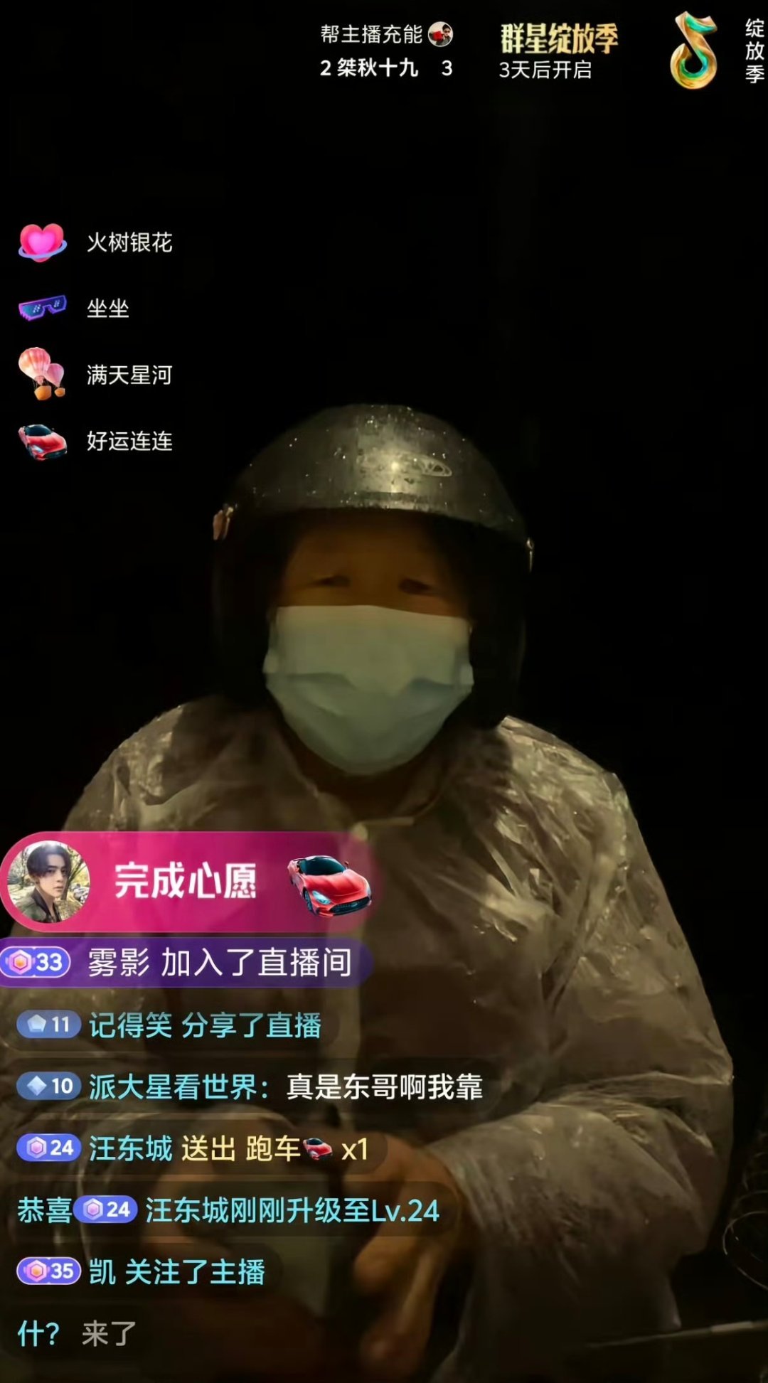 汪东城凌晨刷礼物 凌晨四点,汪东城点进了一位农村大姐的直播间。她戴着头盔、裹着雨