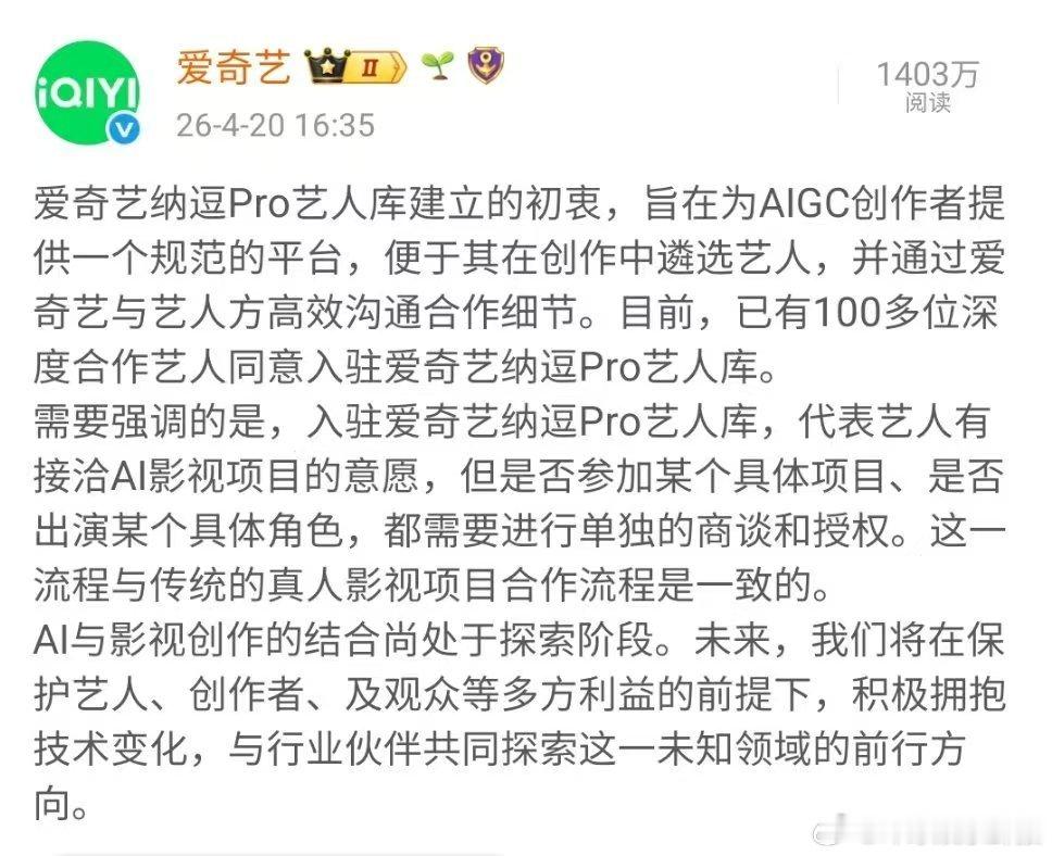 爱奇艺回应艺人AI制作合作爱奇艺CEO回应AI艺人库争议爱奇艺回应争议,纳逗艺人