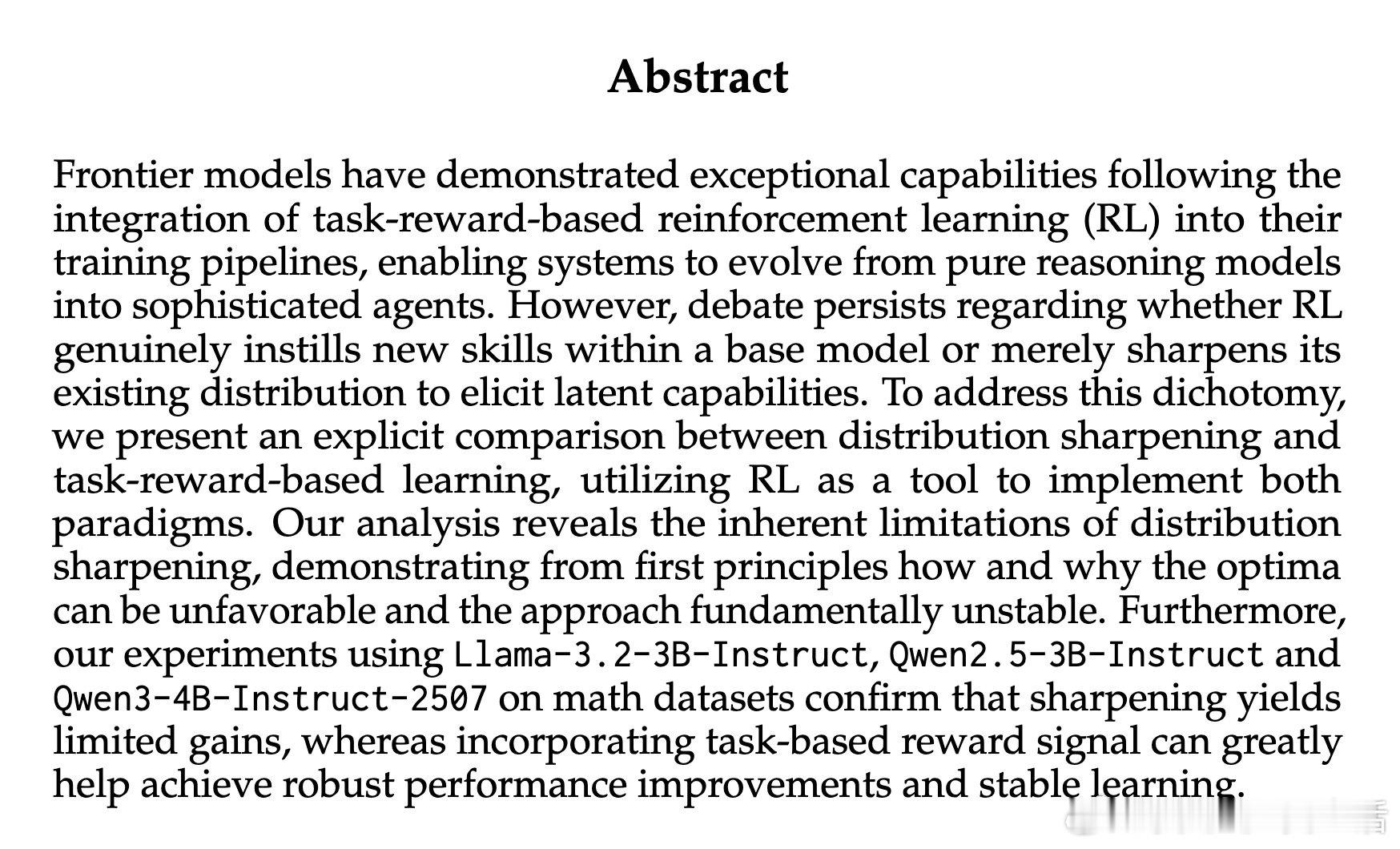在大语言模型后训练领域,强化学习究竟在"创造"新能力还是仅仅"挤压"既有能力,是一个悬而未决的核心争议。过去支持分布锐化假说的工作受困于缺乏受控对比——推理时方法与训练时方法混用,无法剥离信号来源的真实作用。