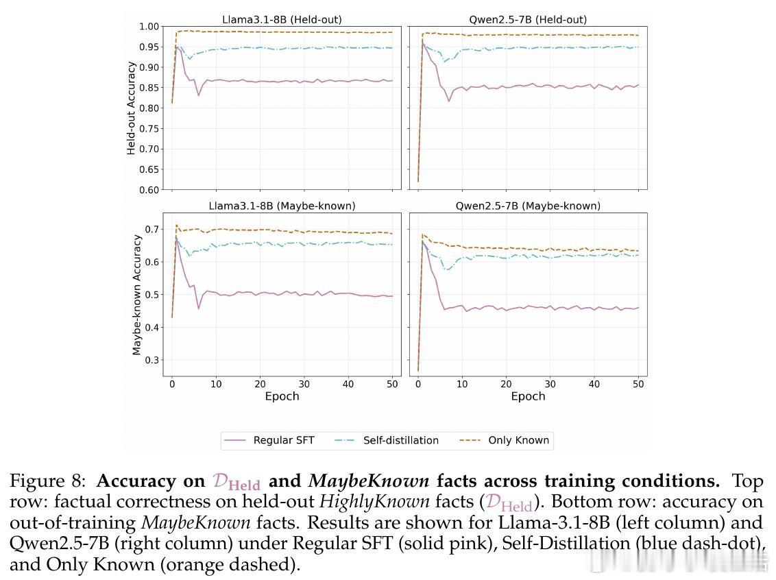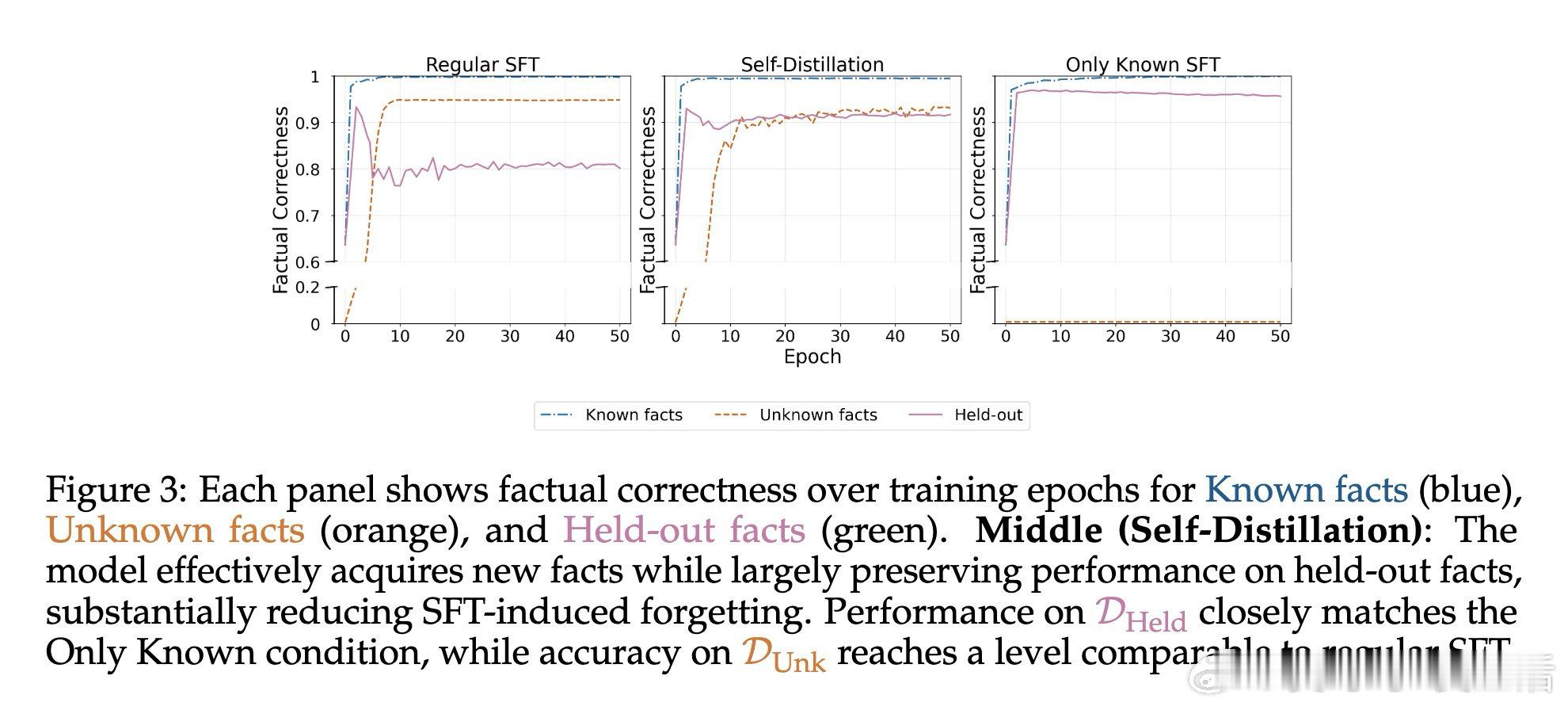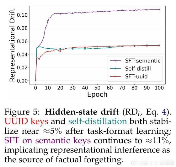 本文的核心洞见是:把微调诱发的幻觉重新看作一种持续学习中的"事实遗忘"。由此,将自蒸馏约束引入微调过程这一关键操作使问题得以解开——通过让学生模型的输出分布不偏离冻结教师模型,梯度更新被阻止沿语义重叠的表征区域传播,从而将遗忘率从约15%压缩至约3%,同时不牺牲新知识的获取能力。