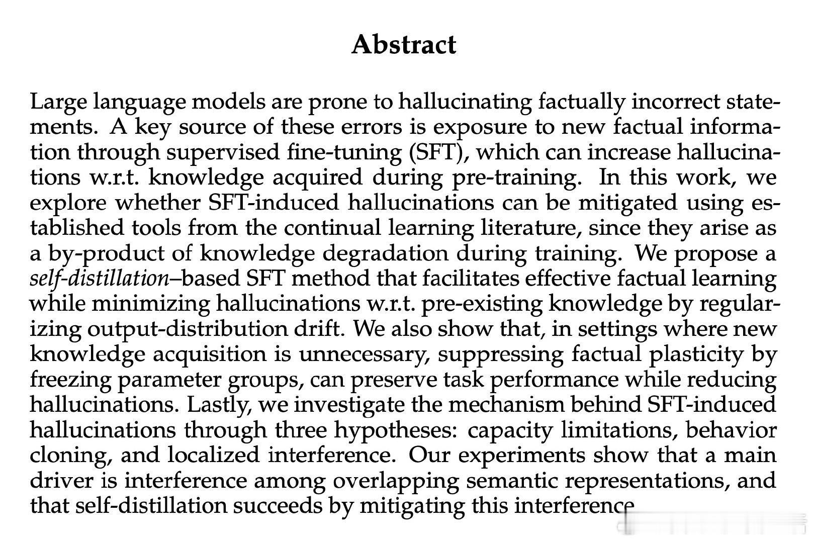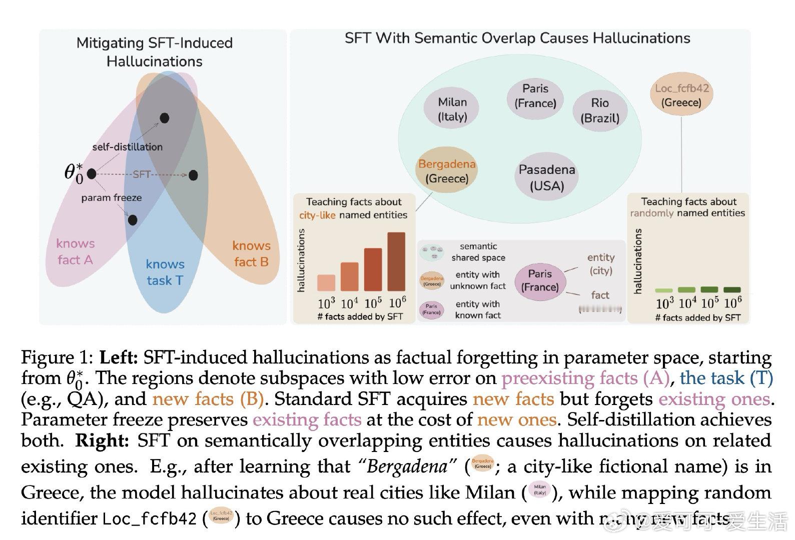 在大语言模型的微调领域,幻觉问题是一个悬而未决的难题。现有方法试图通过对齐训练来纠正错误输出,却始终未能触及根本——模型在学习新事实时,会系统性地遗忘预训练阶段已掌握的知识,而这一"遗忘机制"本身才是幻觉的真正产房。