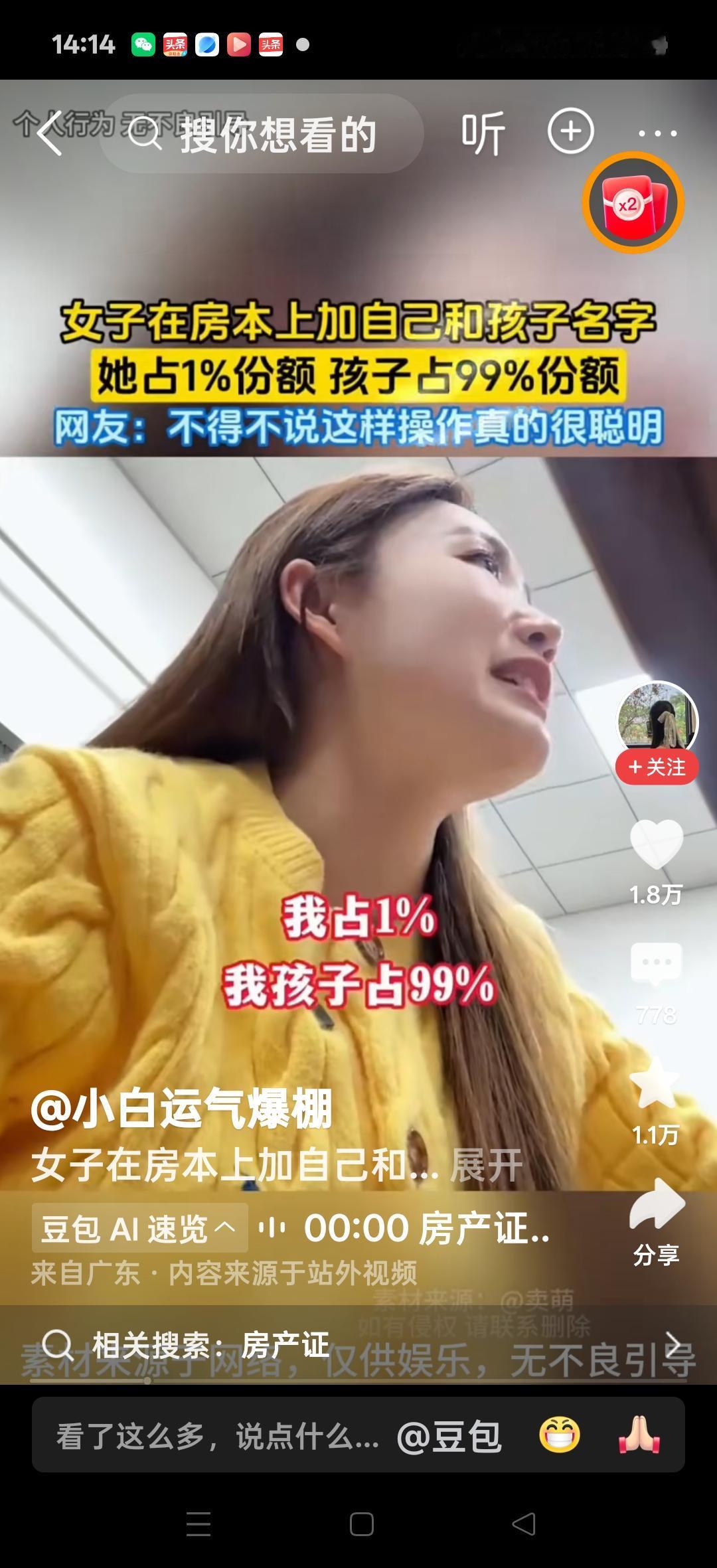 女子在房本上加自己和儿子的名子,她占1%的份额,孩子占99%的份额。网友说:以前看到一个消息也是女儿99%,结果女儿20多就挂了,女婿平白分走了大部分。有的人说:别误导了,昨天刚去房管局,根本不给加名字,等18岁才给办,还要孩子到场同意才行,拍视频前先去房管局,问好了再拍,要加只能买房时在售楼处直接写。有的人说:弊端是孩子成年后,如果再买房子,就没有首套房的优惠政策了!有的人说:这个办法看起来很聪明,省下不少遗产税,实则一点儿也不安全。这年头,败家子一堆,虽然他贷款和卖房子都需要你签字,但是他的私人贷款,信用卡还不起被起诉,那房子执行的可是99%的价值!大家说是这样的吗?
