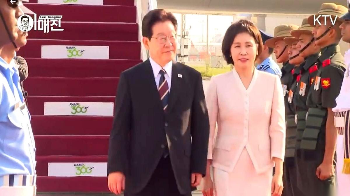 脚刚落地,金惠景另一只手已经开始拨弄那几根不听话的头发。她一边走一边整理,表情却始终带着笑,跟迎上来的印度官员自然地握手、打招呼。