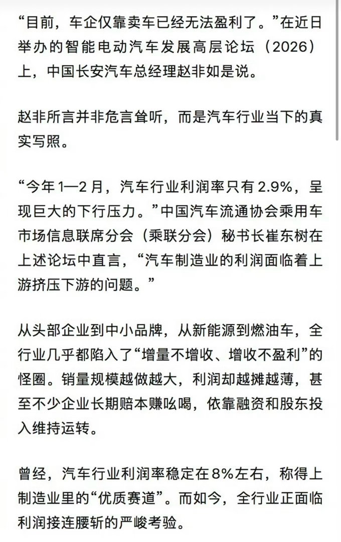 近70款车集体降价现在不少车企单靠卖车已经没法盈利了,竞争进入白热化阶段了。品牌们价格越卷越低,有的车型一年就降价20%,汽车行业利润低到2.9%。有的甚至亏本卖车,靠融资维持运转。