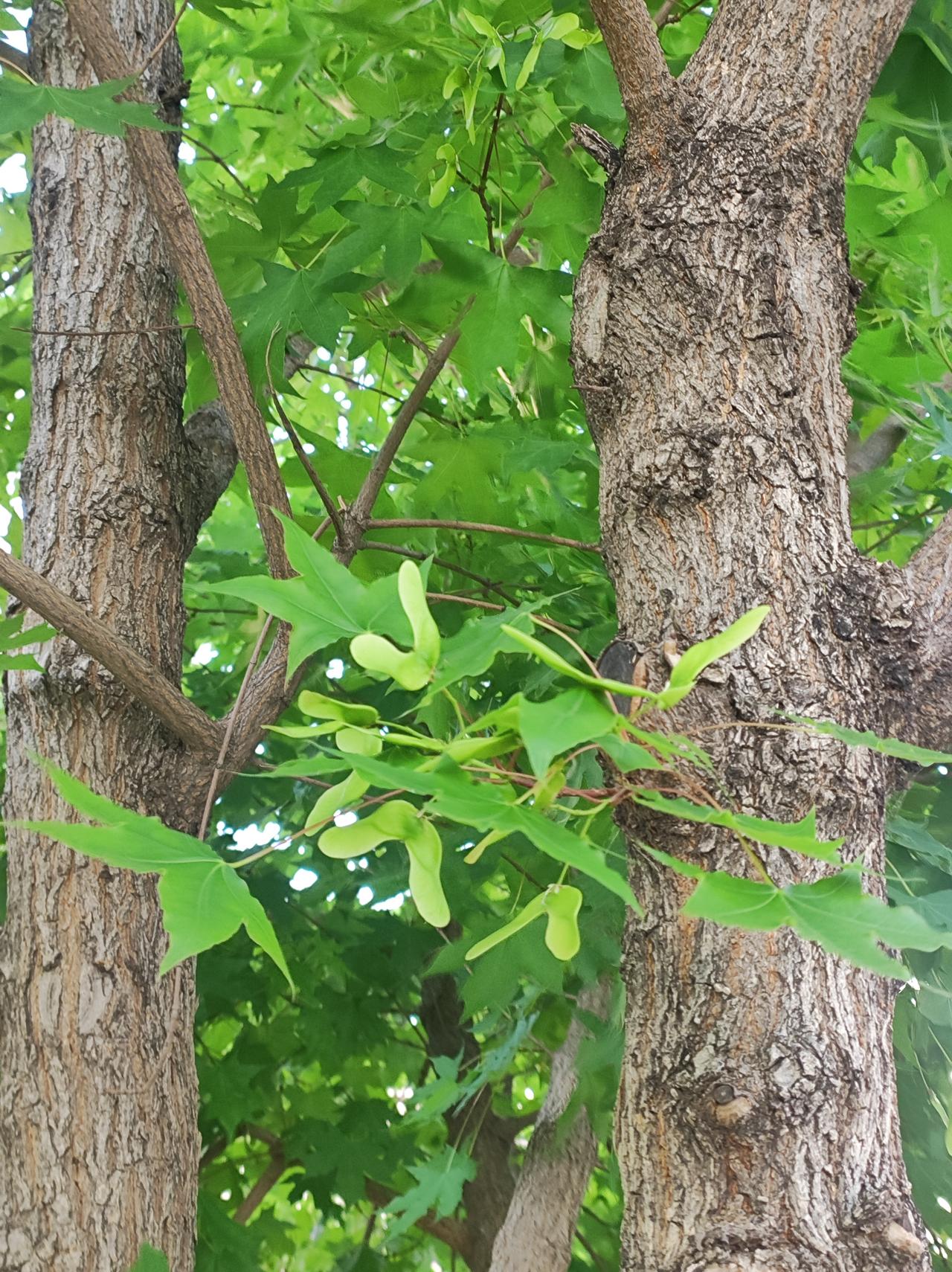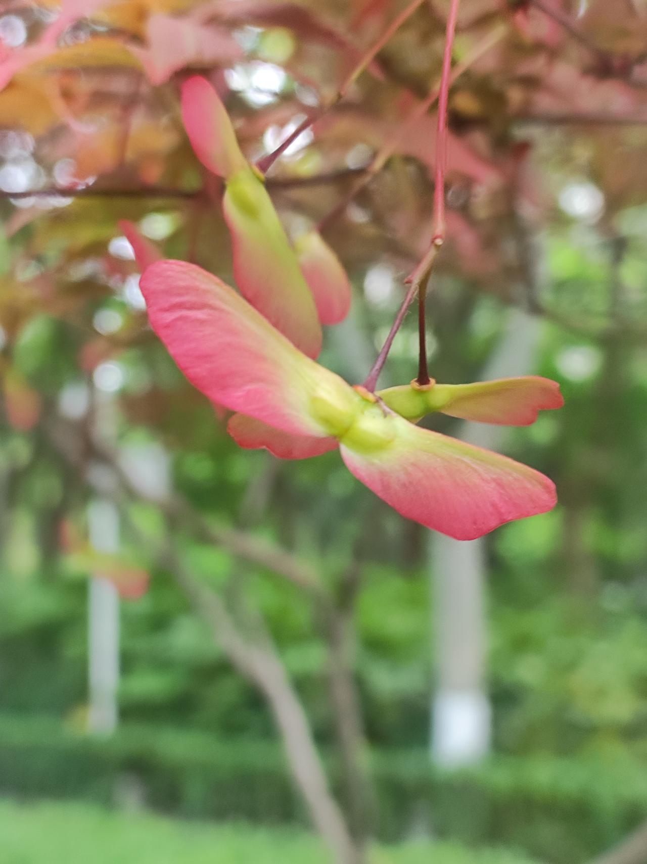 枫树的果实 枫树的叶子漂亮,霜染后红如火更漂亮。 昨天才发现有三种: 一种春天