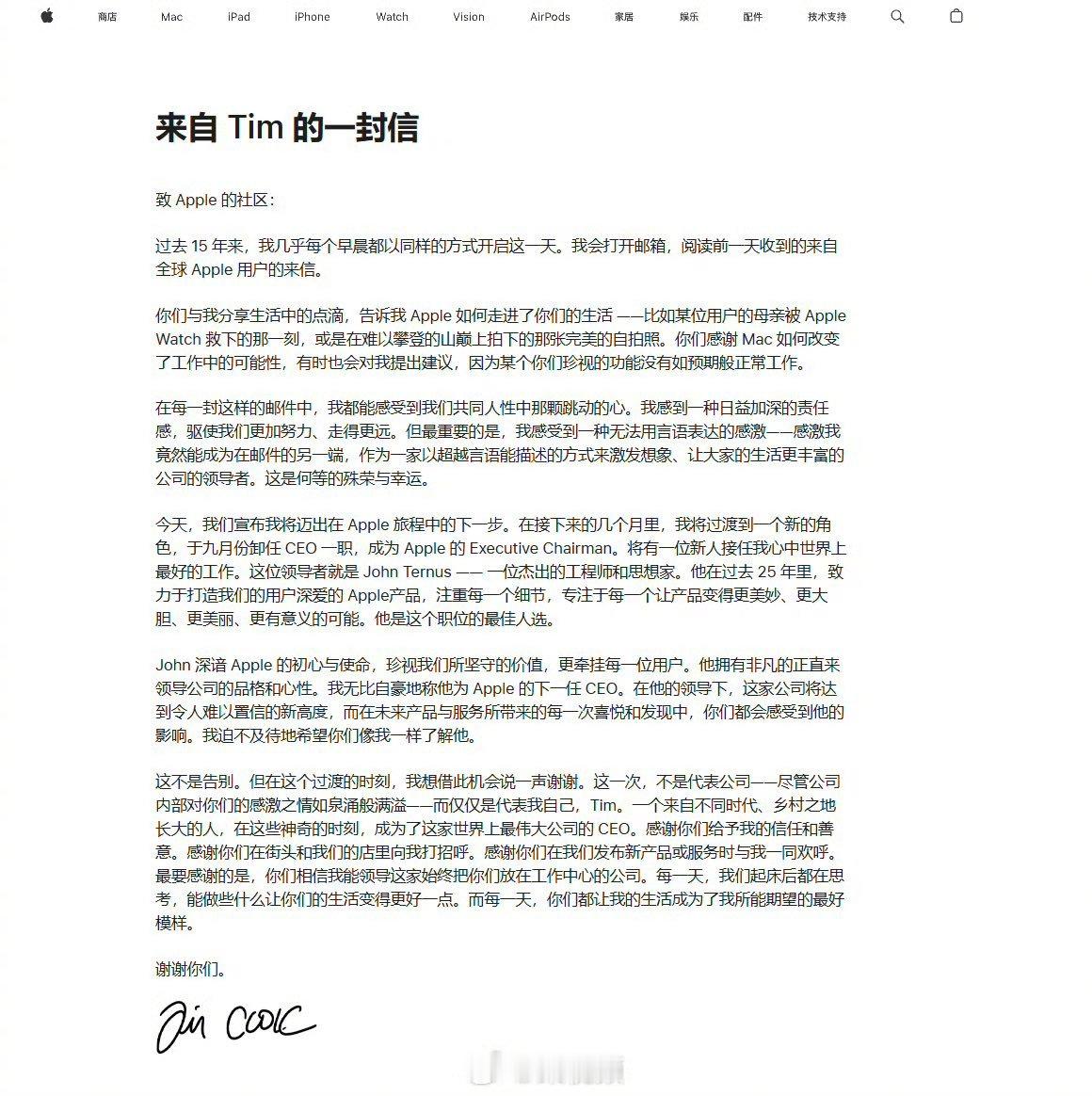 库克不再担任苹果CEO,一个时代结束了苹果周一表示,约翰·特纳斯将于9月1日接替
