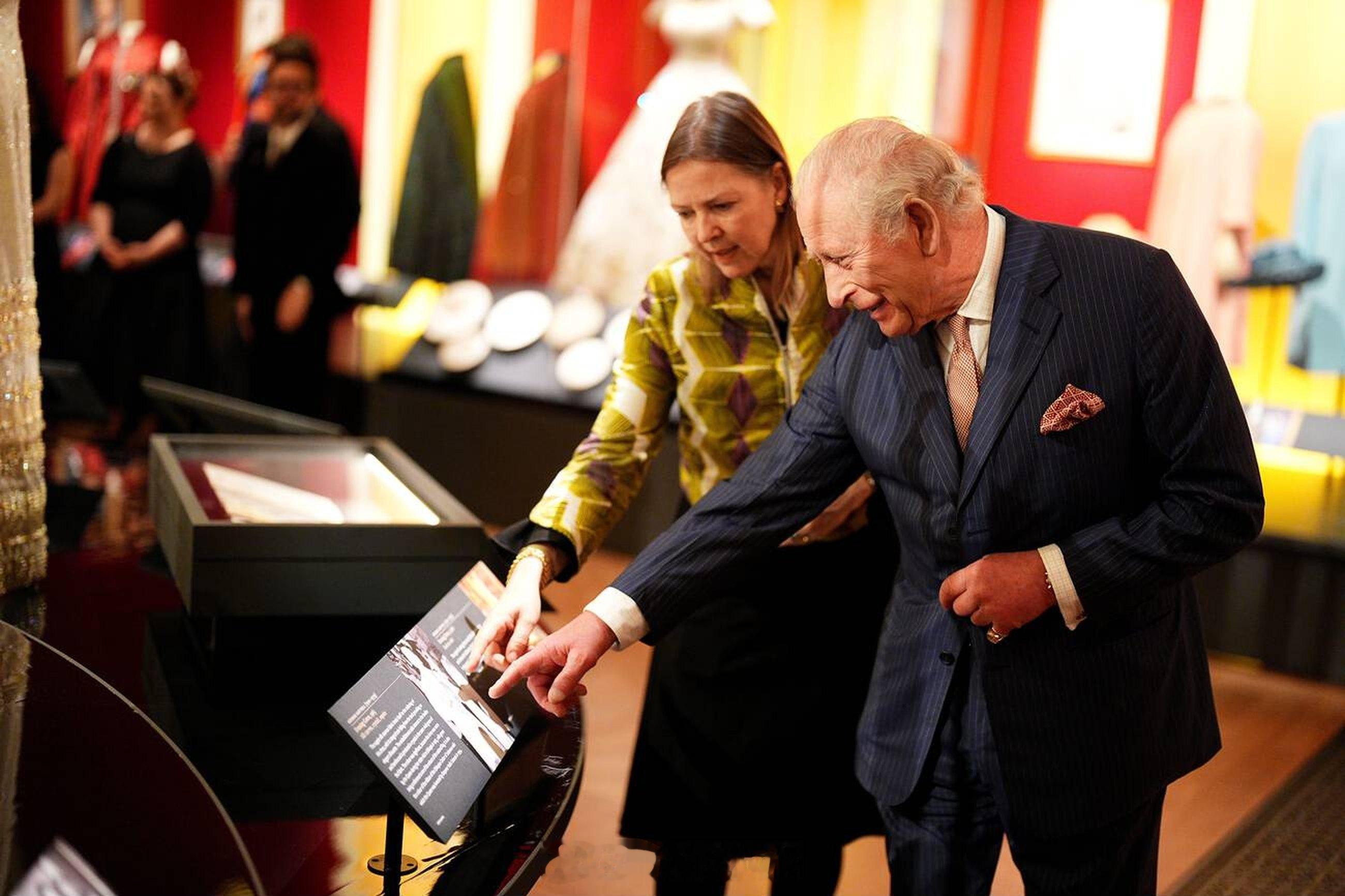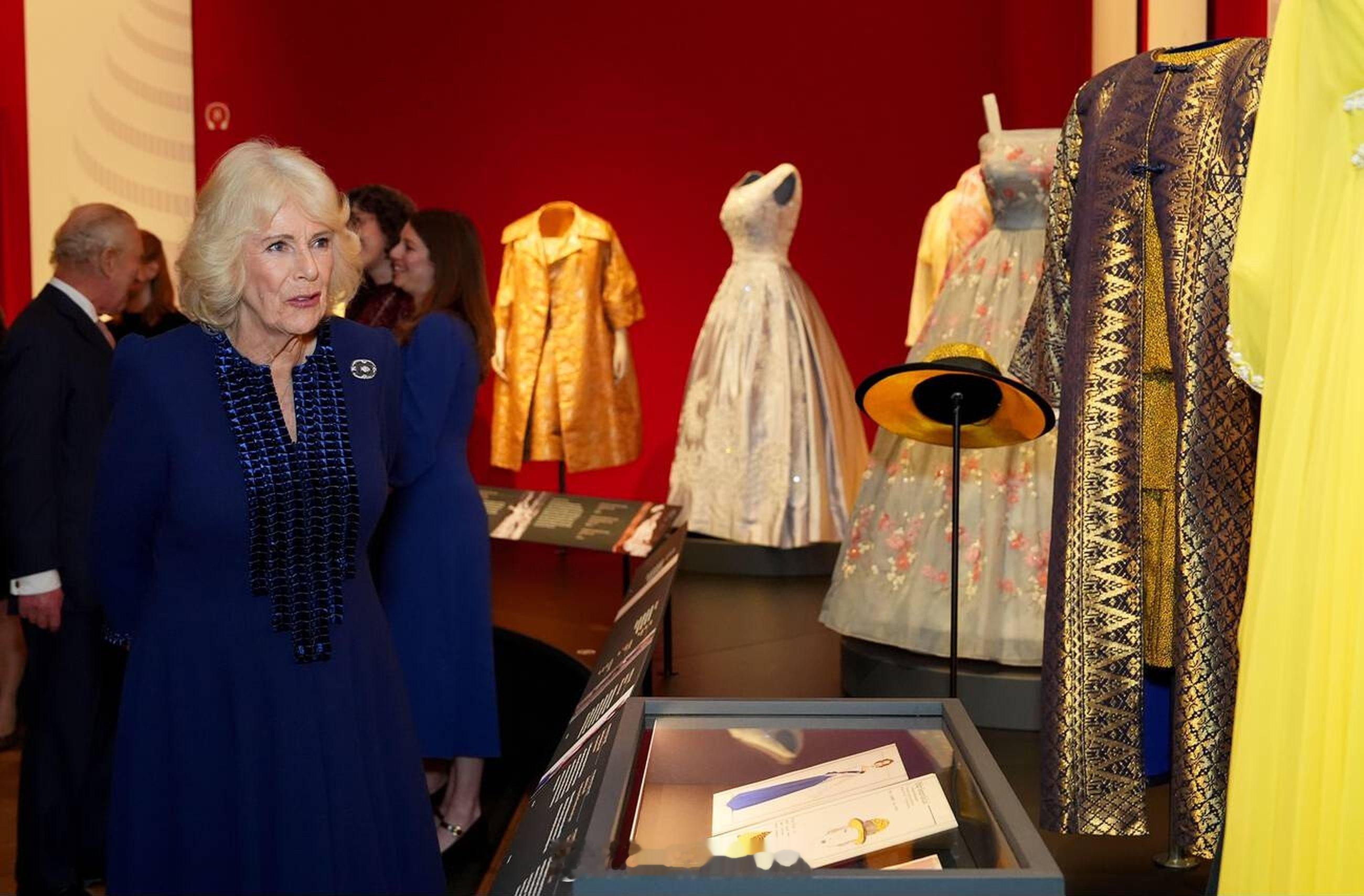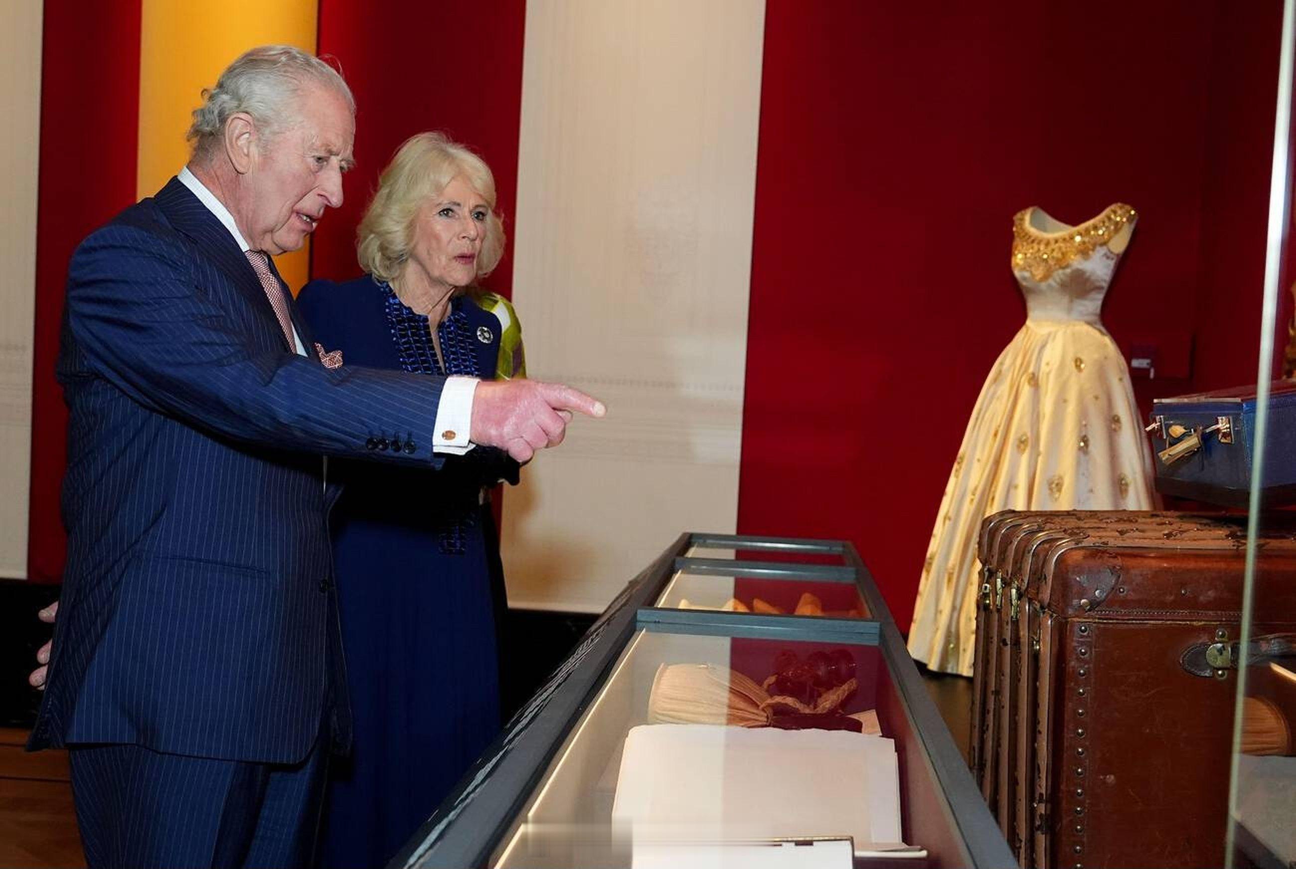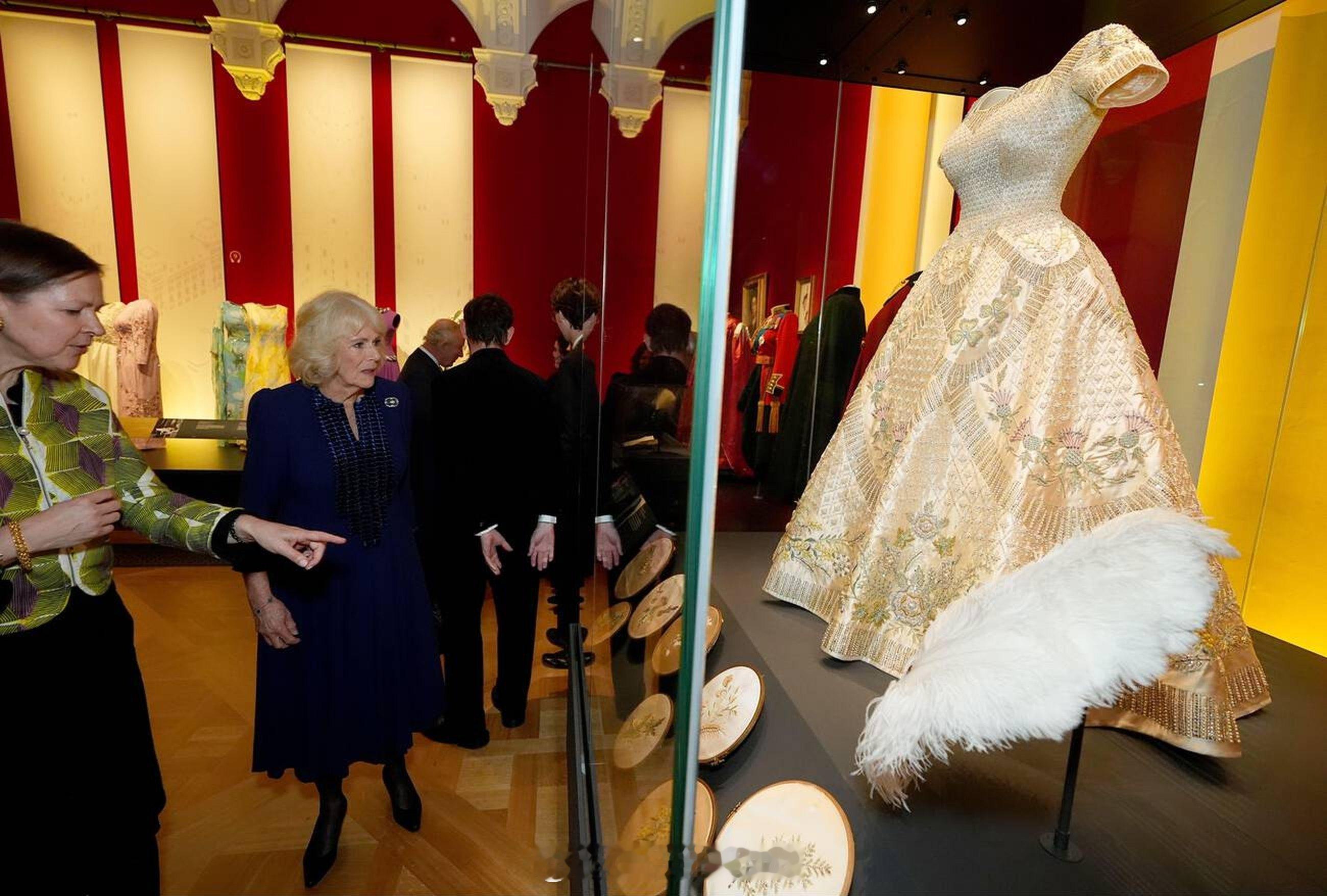 2026年4月20日,正值伊丽莎白二世女王的百岁诞辰之际,查尔斯三世和卡米拉王后在白金汉宫国王画廊浏览伊丽莎白二世女王时尚展。
