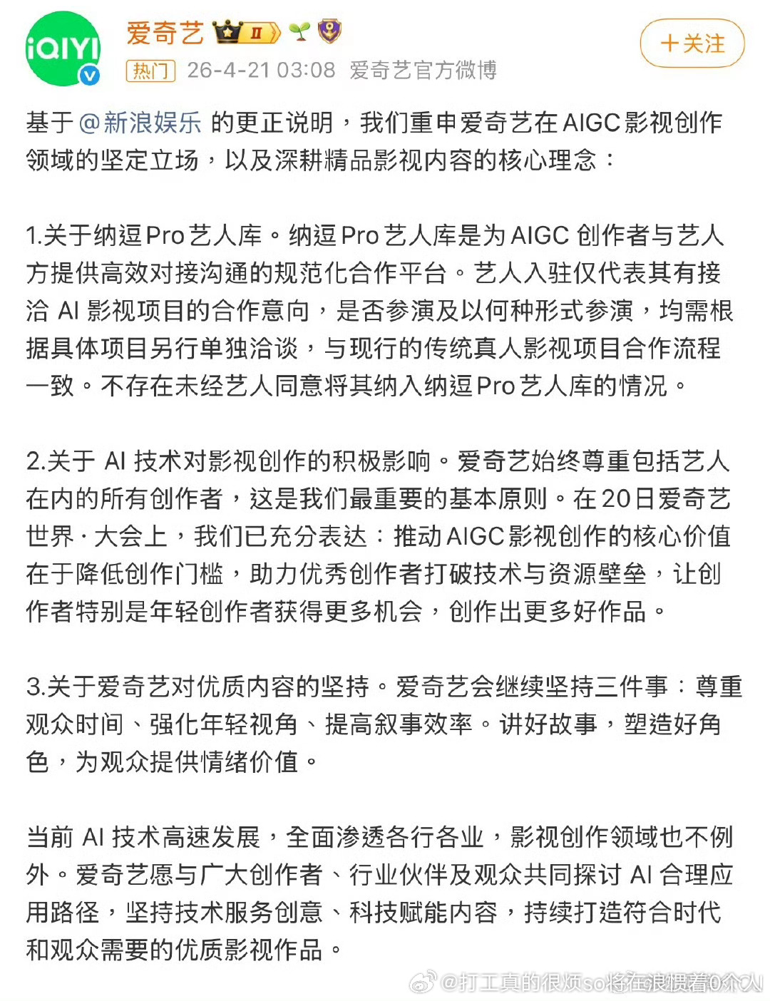 张若昀、于和伟和王楚然不在AI艺人库里。爱奇艺强调:艺人库里提及的艺人之前都是有