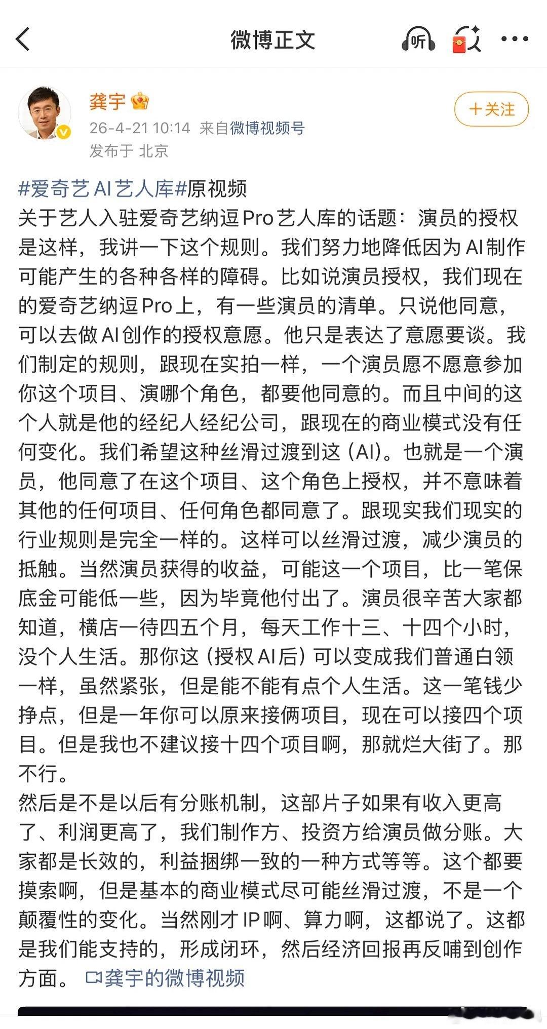 实在不行让ai替龚宇写吧…… 爱奇艺CEO龚宇发声 AI观众 充会员