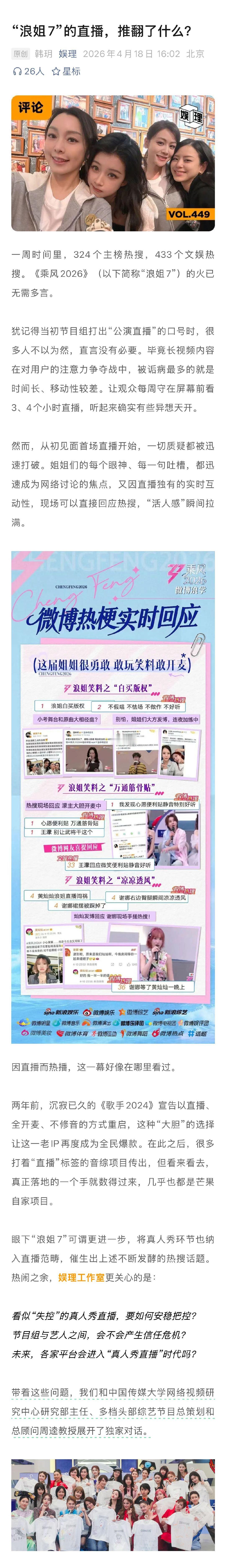 学者谈浪姐7直播难度 何炅直播主持功力 不是所有综艺都适合直播。学者周逵的判断很明确,脱口秀、Sketch等喜剧类综艺肯定不行,像《哈哈哈哈哈》这样需要大量外景、时间线拉长的公路片真人秀更是不行。直播的边界大致以唱跳舞台为核心,辅以外围真人秀的视角。“这套直播体系太繁琐了,对团队经验、现场调度、信息回传、导演决策的要求极高。所以直播真人秀并不是一个未来各个平台都会走向的主流趋势,能做到的终究是少数。”