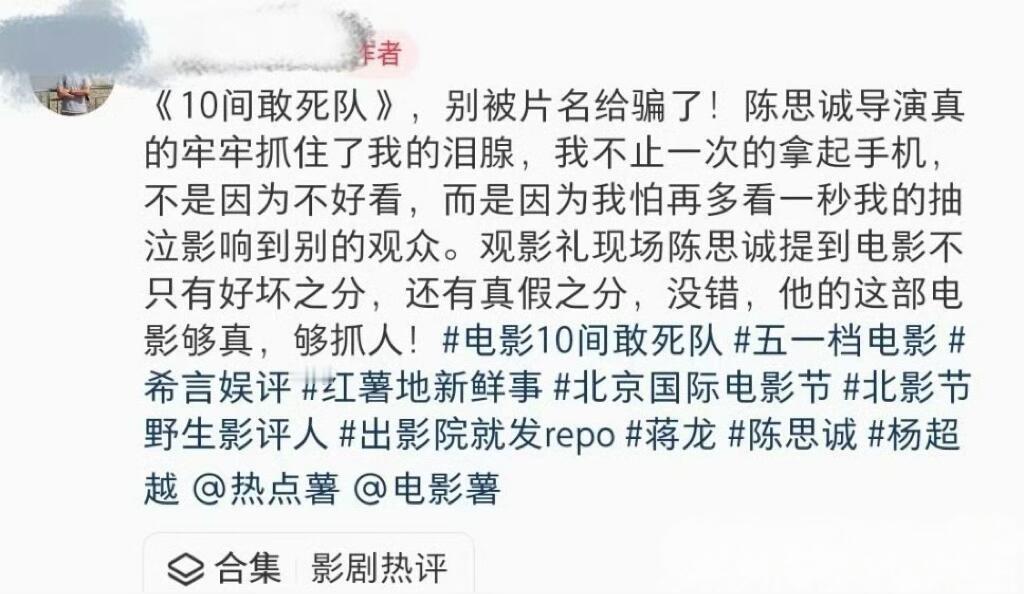 10间敢死队北影节含金量啊啊啊啊啊,一直力荐的《10间敢死队》北影节场刊第一!!这个分数历年场刊里也很能打欸而且北影节官宣了加场的消息,这可是北影节主竞赛单元首次加映!陈思诚导演的新作,老戏骨➕实力新生代演员,五一档必看!陈思诚新片北影节发力了