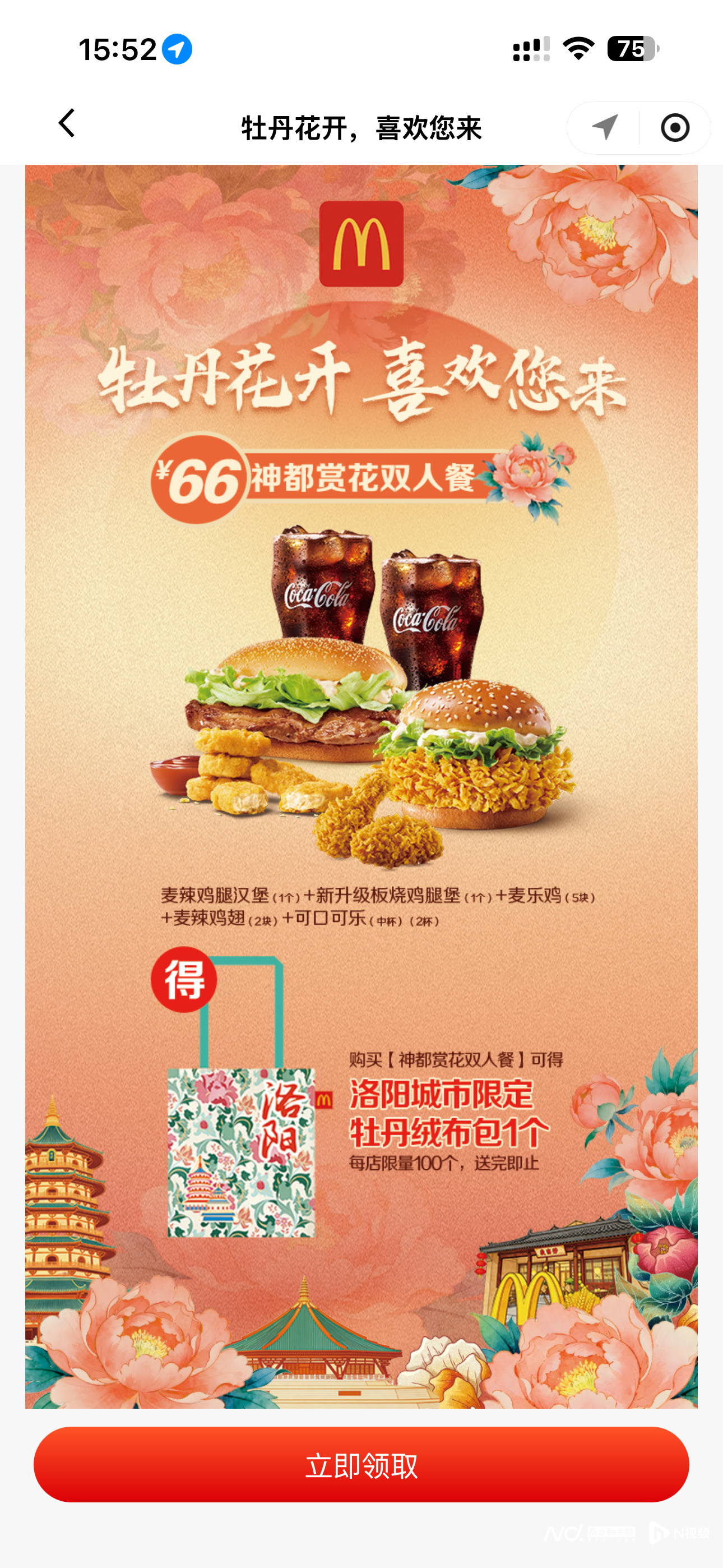 麦当劳被质疑抄袭的帆布包,是其与洛阳牡丹节联名推出的限定产品。消费者消费66元、购买“神都赏花双人餐”则可以获得洛阳城市限定牡丹绒布包1个,洛阳每家门店的帆布包限量100个。4月21日下午,记者通过官方点餐小程序,已经在洛阳麦当劳餐厅检索不到相关产品。有门店店员告知,该套餐已经下架。