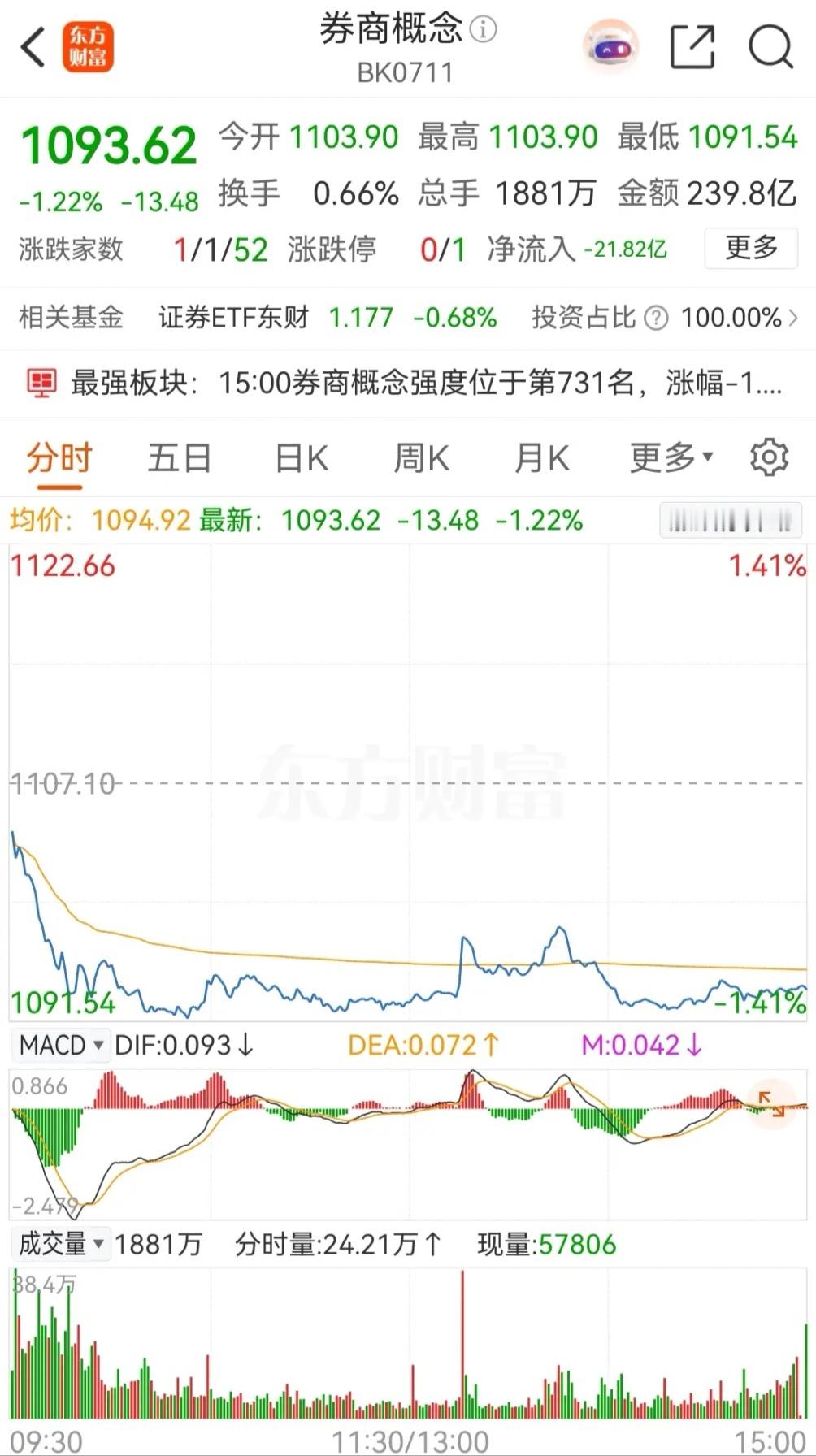 券商板块中有个股跌停了!概念板块今天低开跳水后在低位横盘整理,全天跌幅为1.22