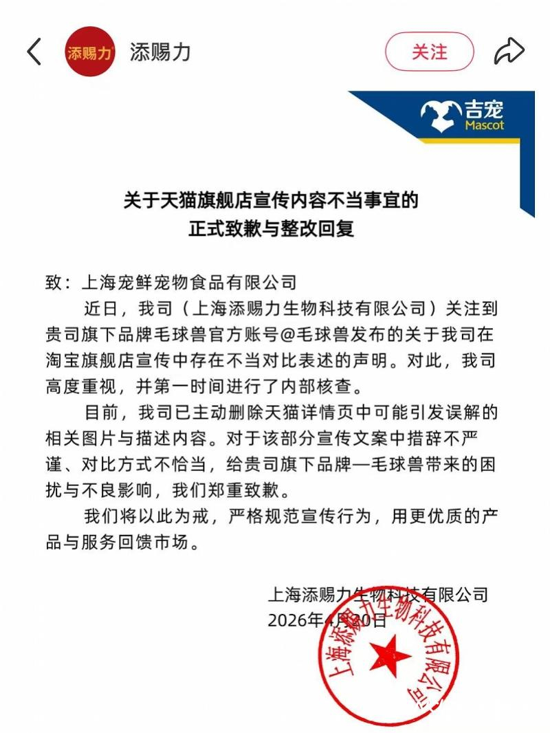 针对毛球兽的投诉,4月20日,添赐力也在官方账号发布了致歉声明。添赐力表示,公司高度重视,并第一时间进行了内部核查。目前,公司已主动删除商品页面中可能引发误解的相关图片与描述内容。对于该部分宣传文案中措辞不严谨、对比方式不恰当,给毛球兽带来的困扰与不良影响,公司郑重致歉。添赐力表示,将以此为戒,严格规范宣传行为。