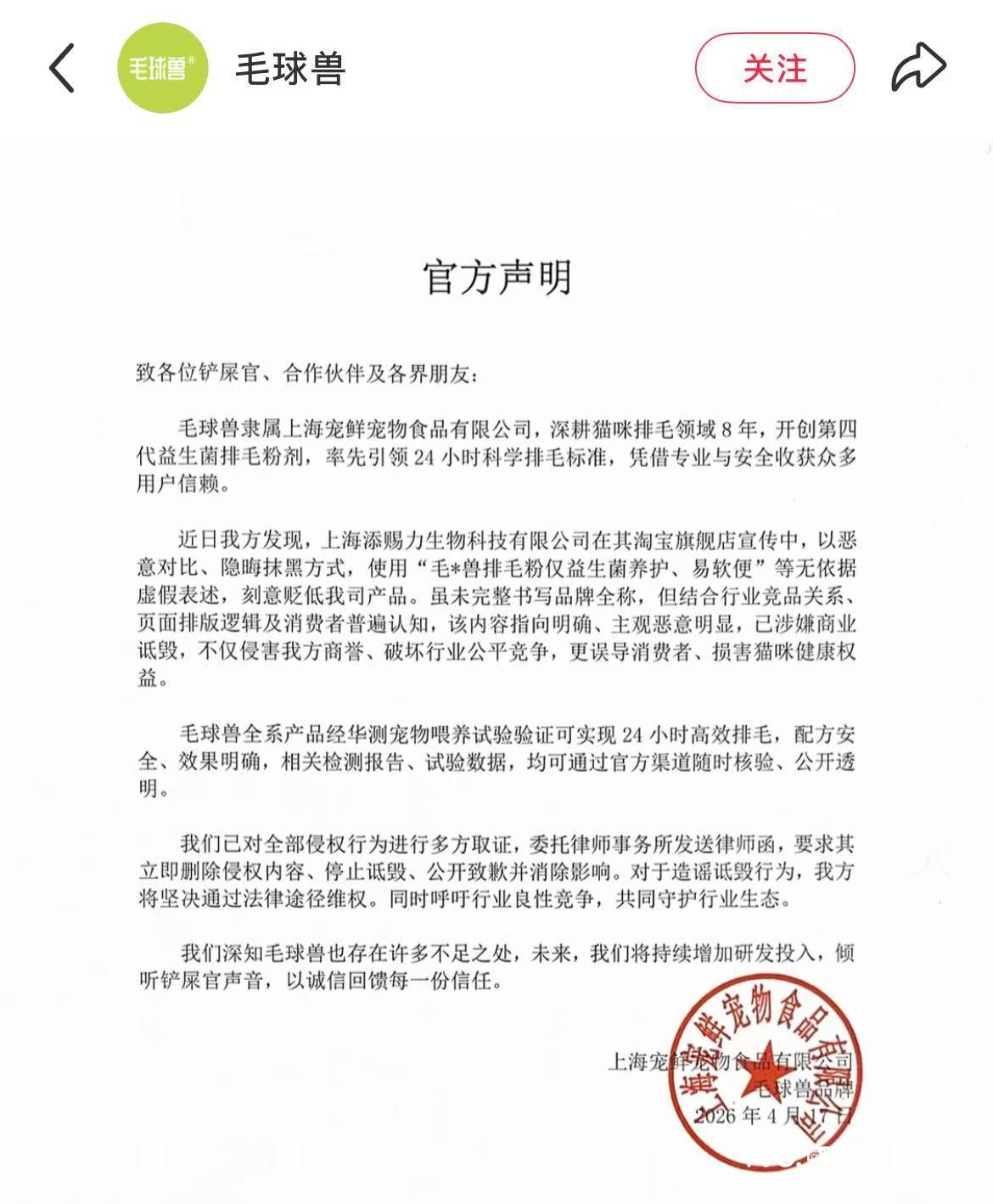 根据毛球兽发布在官方账号的声明,毛球兽表示,近日该公司发现,添赐力在电商平台官方旗舰店以恶意对比、隐晦抹黑方式,使用“毛*兽排毛粉仅益生菌养护、易软便”等无依据虚假表述,刻意贬低公司产品。