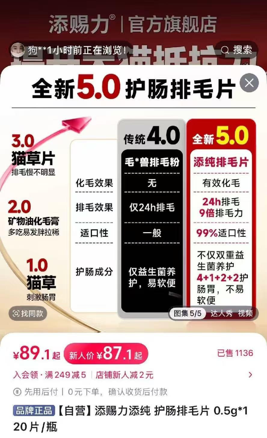 根据社交平台上网友发布的图片,添赐力在电商平台官方旗舰店上架销售的一款护肠排毛片,商品页面将添赐力的排毛片与毛球兽的排毛粉进行对比,对比维度包括化毛效果、排毛效果、适口性与护肠成分。根据该页面,添赐力的排毛片售价89.1元,1瓶拥有20片。