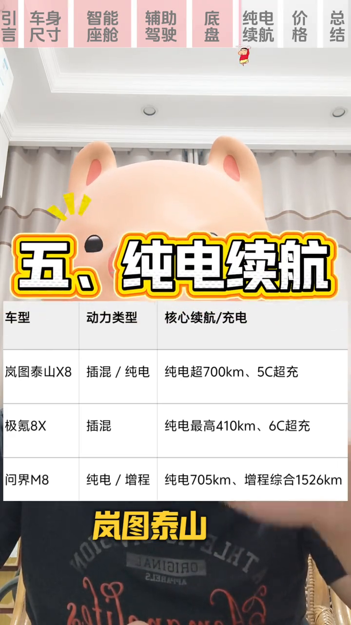 ·第五个在续航上:岚图泰山X8提供了插混纯电版本,插混纯电续航370公里,纯电版续航只要700公里,并且都支持5G超充。极氪8X主打插混性能,问界M8有纯电增程可选。三款车各有侧重。
