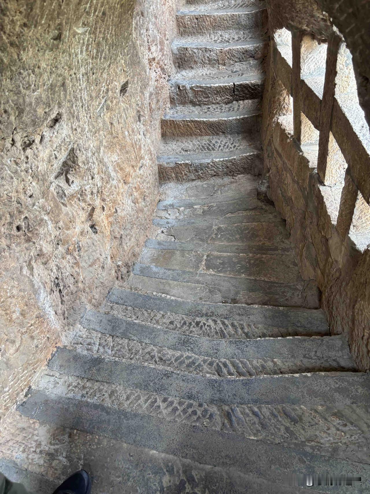 我随着人流开始向龙门进发。山路都是石凿的台阶,不是规则的石板。向上一般四五十度左右,登十来个台阶就得停下来喘粗气,而且能站的空地很窄小。一会儿又开始钻洞,向下也是四五十度,小心翼翼的生怕踩空。有的地段的台阶很窄,我用鞋大概测一下也就35、36的鞋长,不够一只脚完整地放上,更增加了行进的难度。