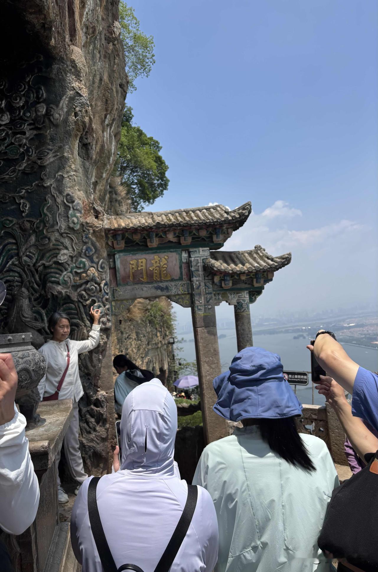 和龙门合影的人群一度滞留。我心里一直惦着龙珠,就穿过人群走到龙门下方,抬起脚跟正好能摸到龙珠,想自拍做不到,求身边一名游客给我按下按钮,几乎是怼着我的脸拍的,虽然构图不太合理,但是我的脸和手摸龙珠的姿态都完整记录下来,我如愿以偿。