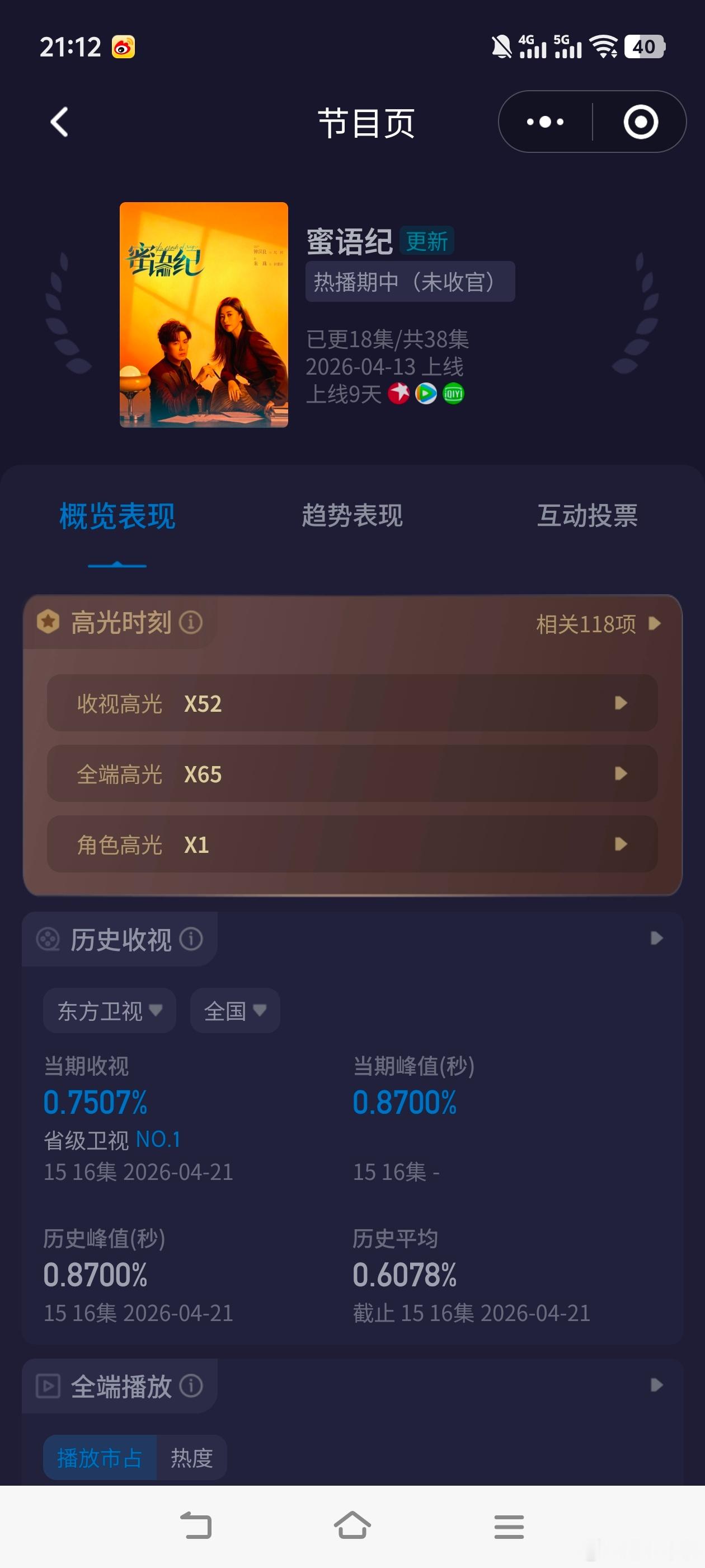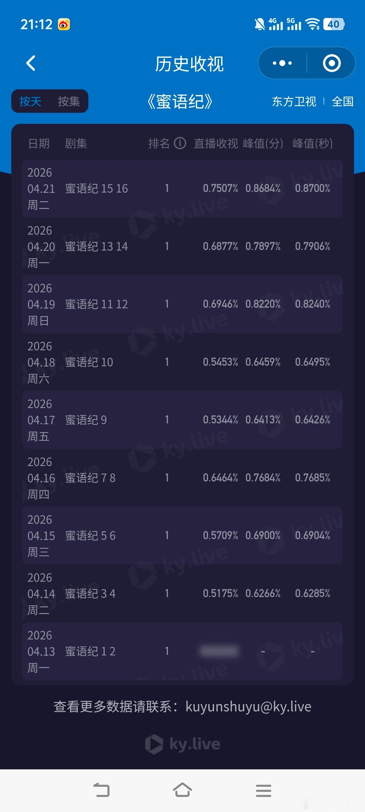 按照这个走势卫视全剧cvb集均可破0.7,年冠基本上没悬念了!蜜语纪收视率破0.8