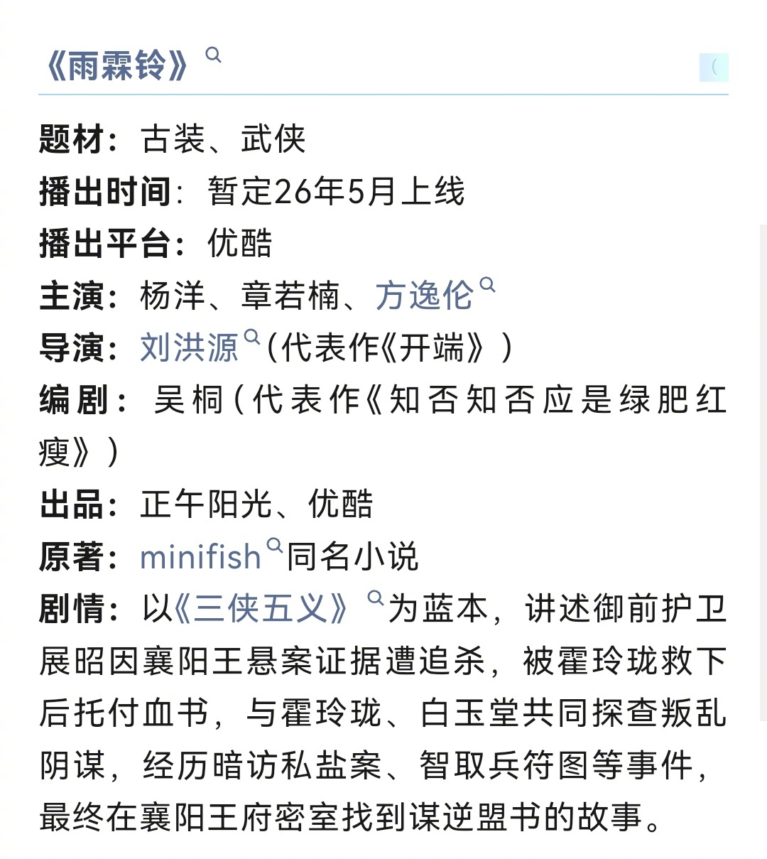 正午阳光的新武侠《雨霖铃》终于要动了!已经开始预热招商~开端导演、知否编剧,杨洋、章若楠、方逸伦、张予曦主演,古装武侠+权谋探案,预计5月下旬登陆央视&优酷。