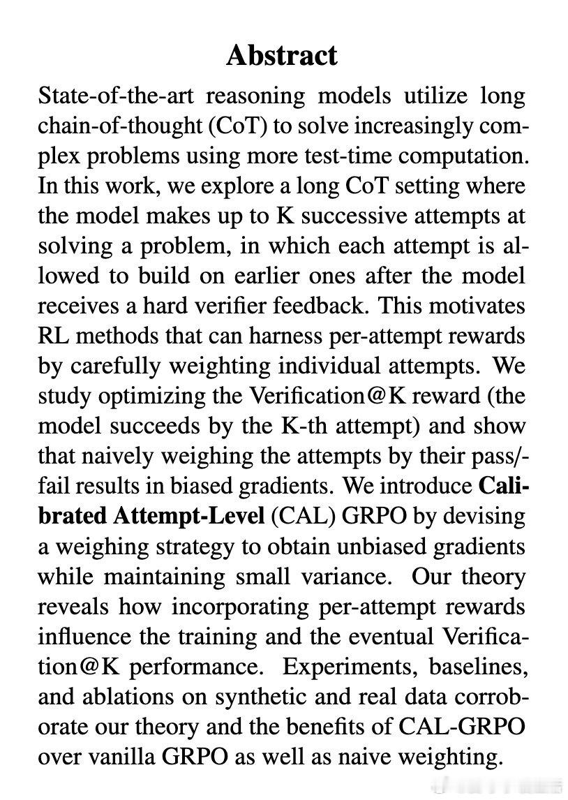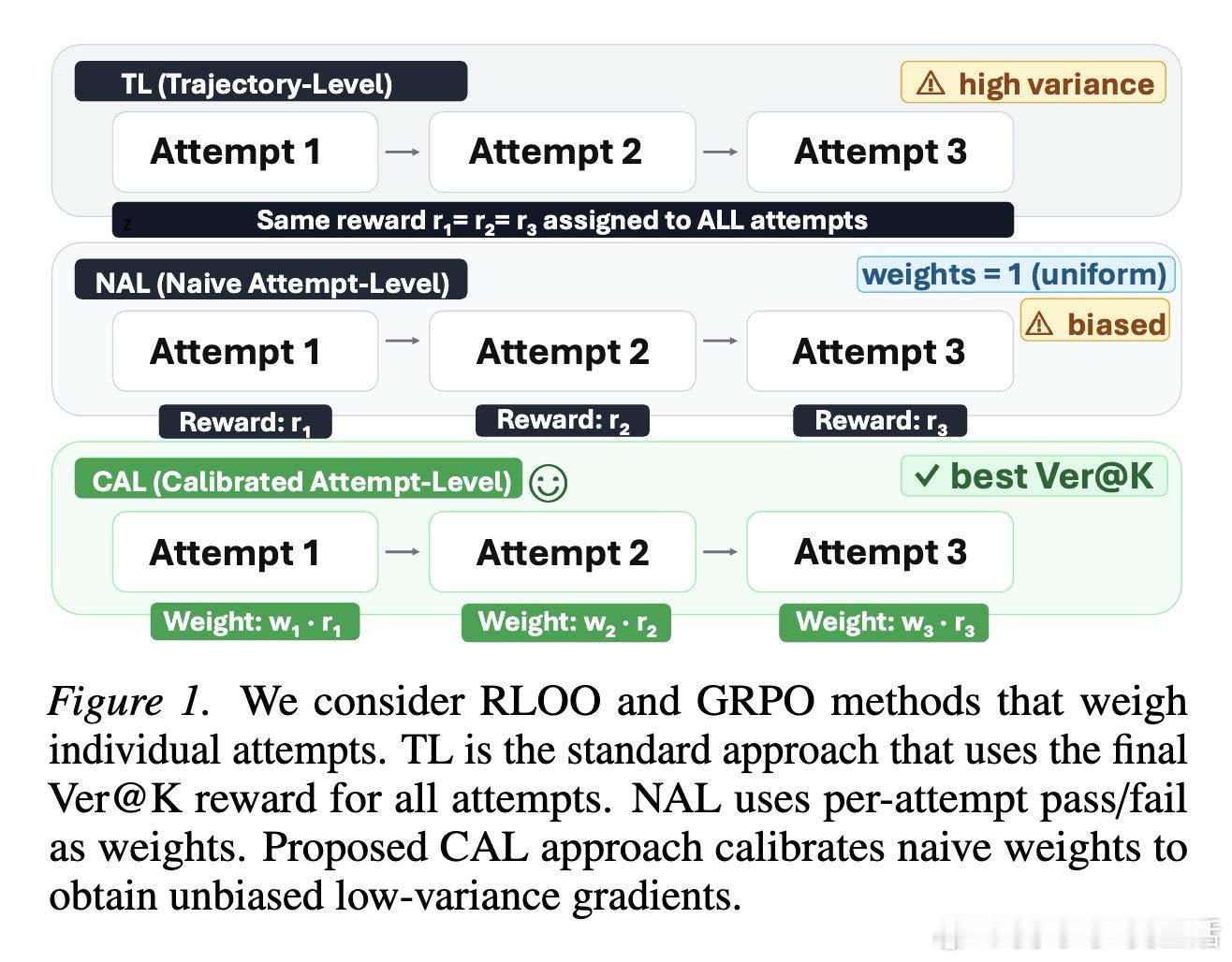 在强化学习与大模型推理的交叉地带,如何为多次尝试分配学习信号是一个悬而未决的难题。过去的方法要么把整条轨迹视为单一单元(损失了密集反馈),要么朴素地按每次尝试的对错赋权(无意中对早期尝试过度投资),本质原因是缺乏一个将各次尝试贡献与最终成功概率精确对齐的权重方案。