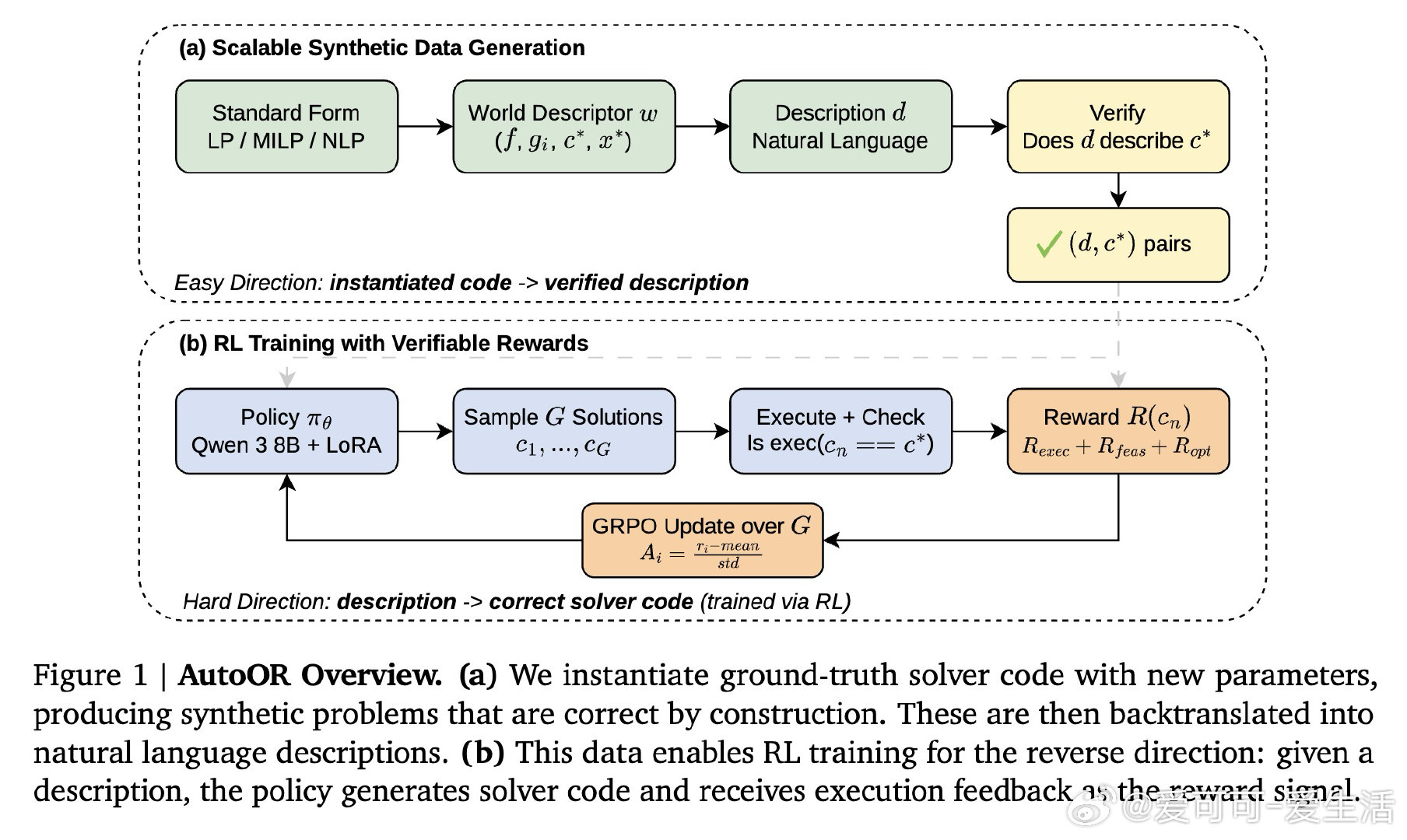 在运筹学领域,将自然语言描述的优化问题转译为求解器可执行代码是一个悬而未决的难题。过去的方法受困于训练数据稀缺且质量低下,本质原因是"从描述生成正确代码"这一方向本身难以验证,而人工标注又无法规模化。