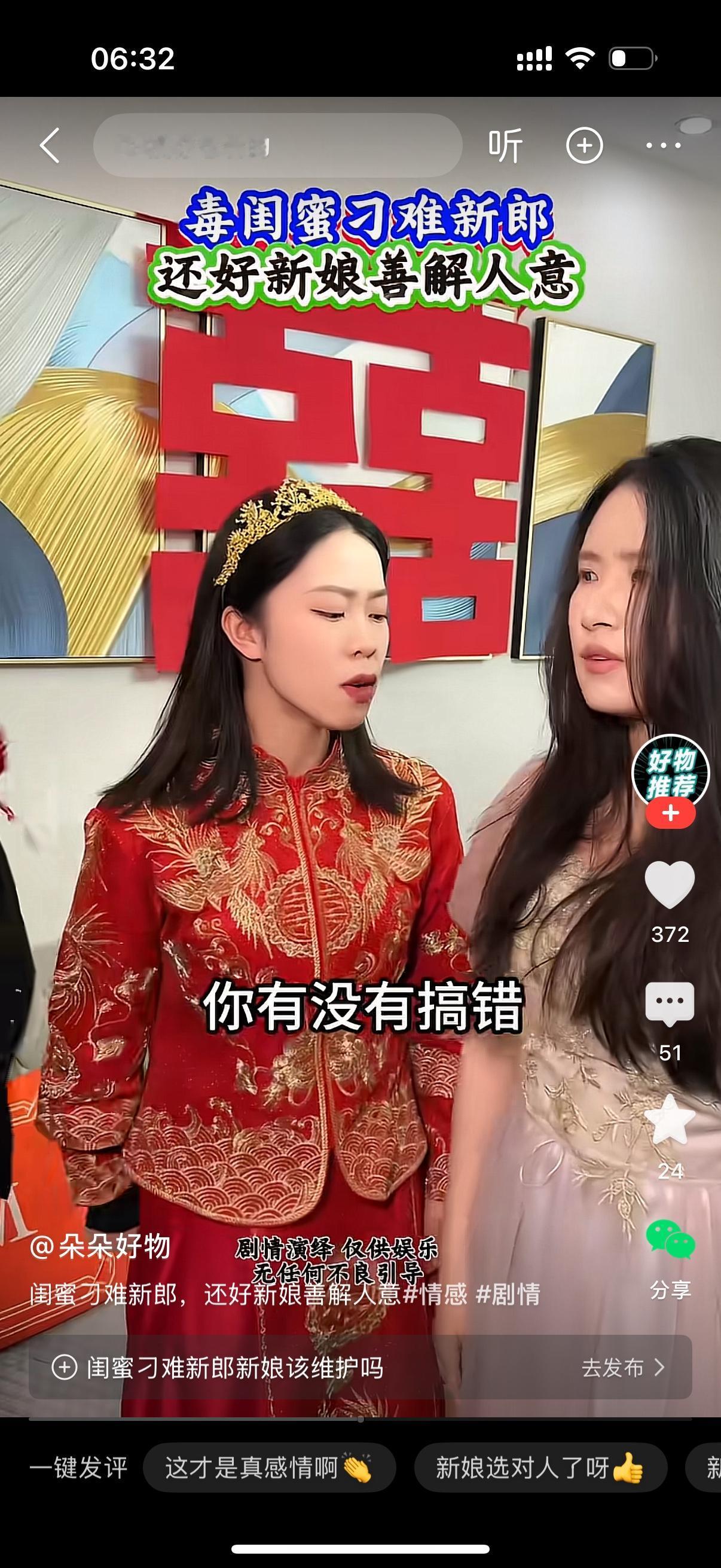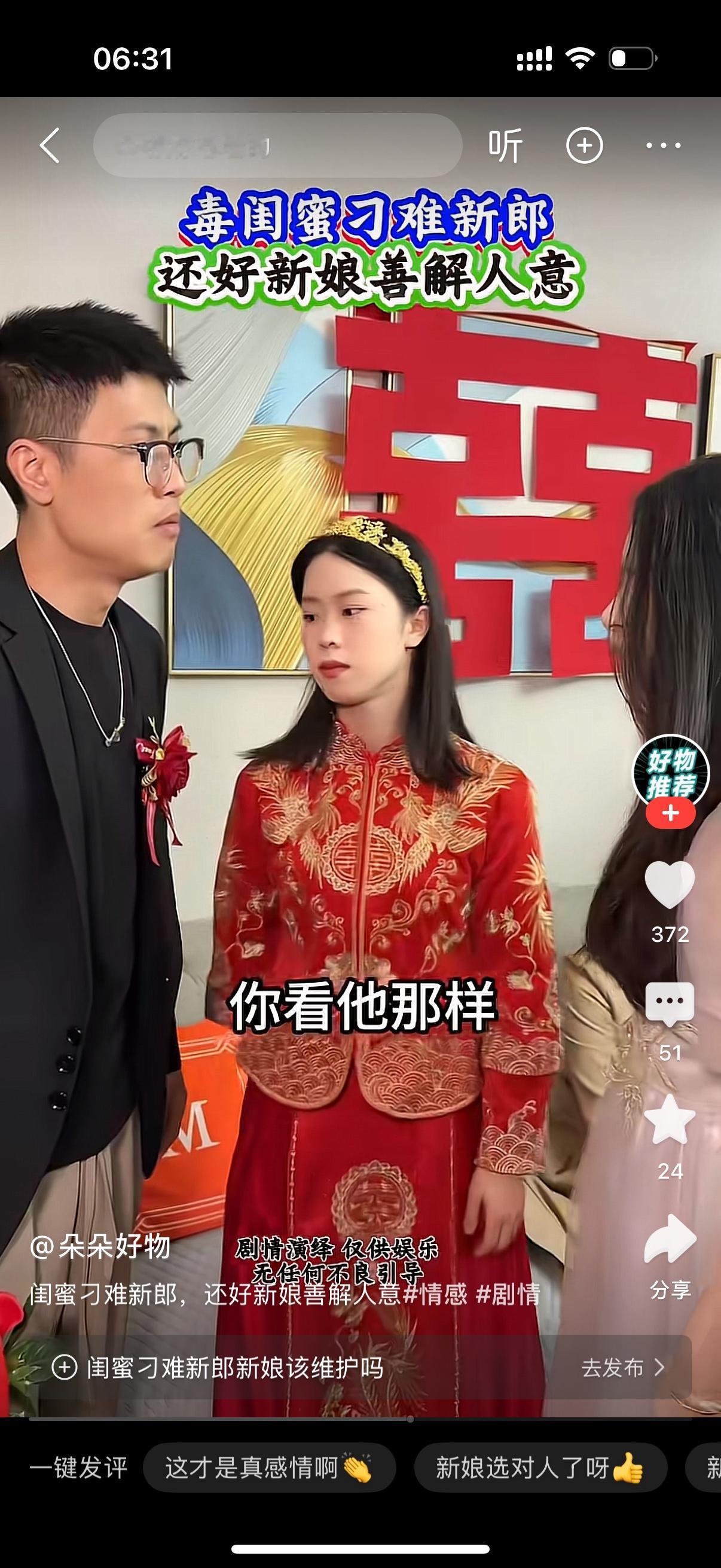 新郎正打算把新娘接出去。新娘的闺蜜拦住他说,等一下,想接新娘,必须得从我的胯下钻过去。说着,新娘的闺蜜把自己的小短腿架在了凳子上。新郎很尴尬,这时新娘站了出来,对着闺蜜怒吼,你干什么啊?今天是我结婚,你有没有搞错啊?闺蜜说,你看他那样,我是为你好。新娘甩手一巴掌打在闺蜜脸上,他什么样也是我的老公。闺蜜脑袋嗡嗡地。