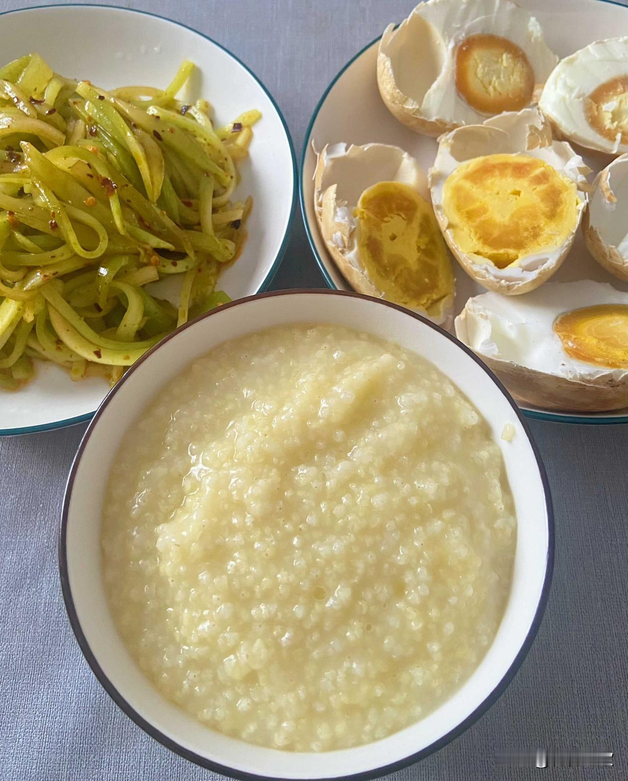 一个淡淡咸香,一个麻辣爽口,两个一起配醇香的小米粥,刚刚好。