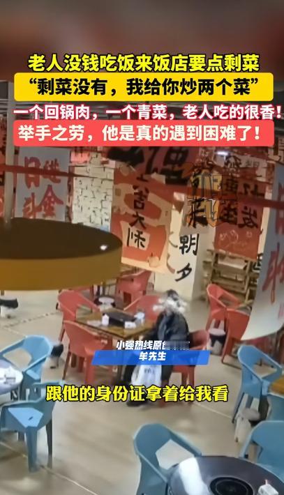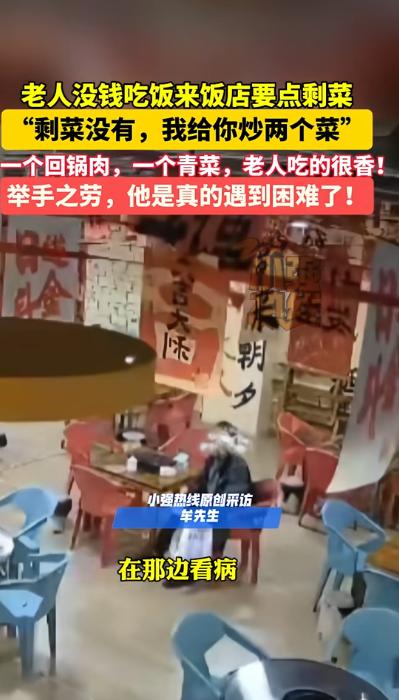 “看哭了!”云南昭通,老人独自在医院看病没钱吃饭,带一盒冷饭进饭店。突然他跟店主说:“能不能给点剩菜?”说完他把自己病历和身份证给店主看,说他不是骗子。店主得知老人的情况后,给他炒了两个菜,一荤一素,还让老人看病期间过来吃饭,每天给老人免费提供两顿饭。