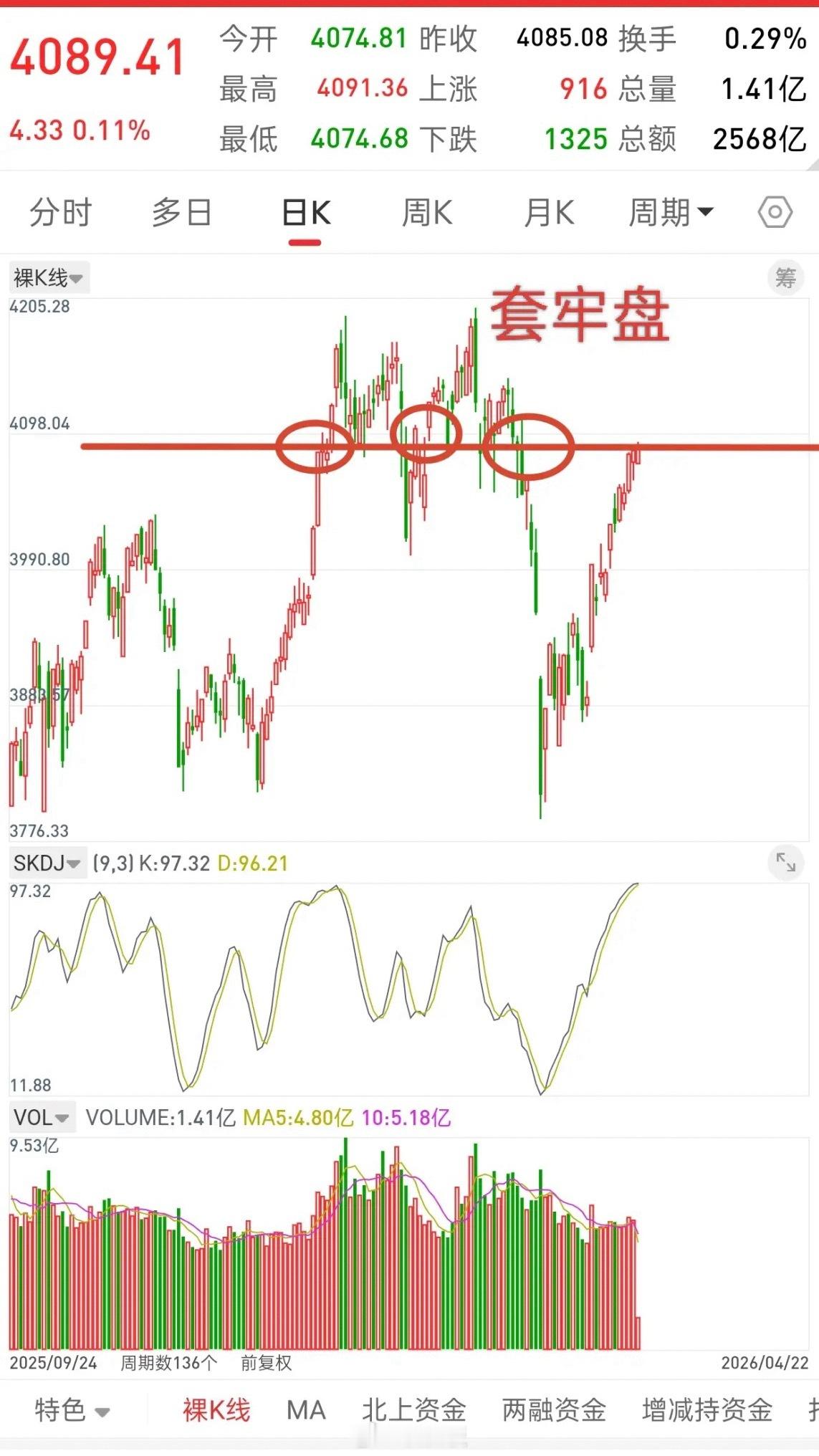 技术形态上,4083-4098以上,全部是套牢盘,底部从3794到目前又有很多获利盘,所以当前行情需谨慎。