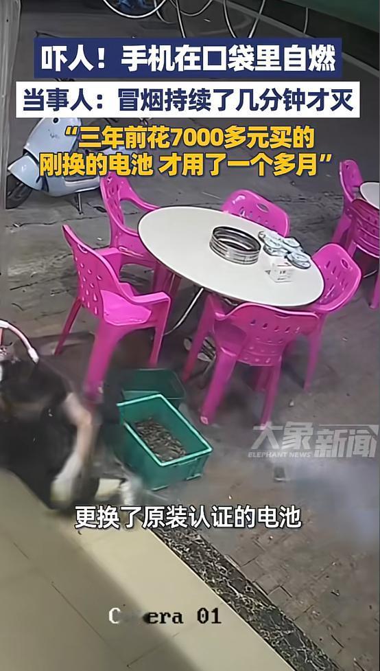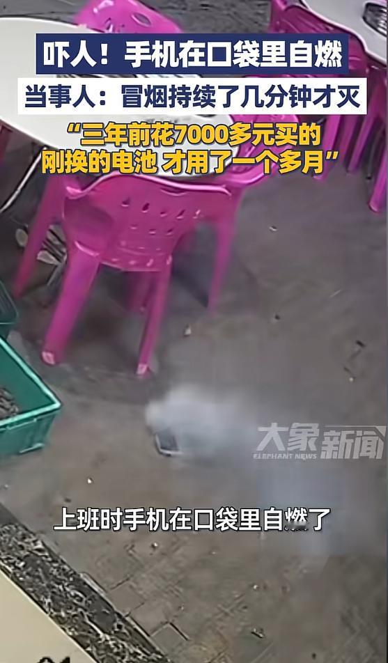 信息来源:《4月18日广东汕尾,手机在口袋里自燃!当事人:冒烟持续了几分钟才灭,三年前花7000多买的,刚换的电池才用了一个多月》大象新闻