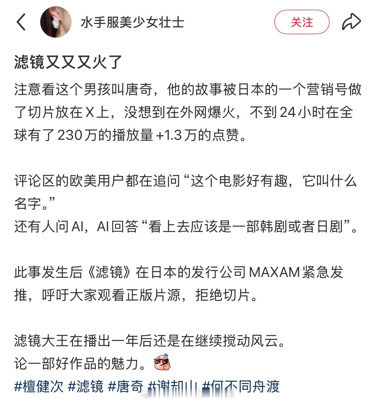 檀健次《滤镜》在外网又🔥了不到24小时播放量破230万,1.3万赞滤镜大王好棒