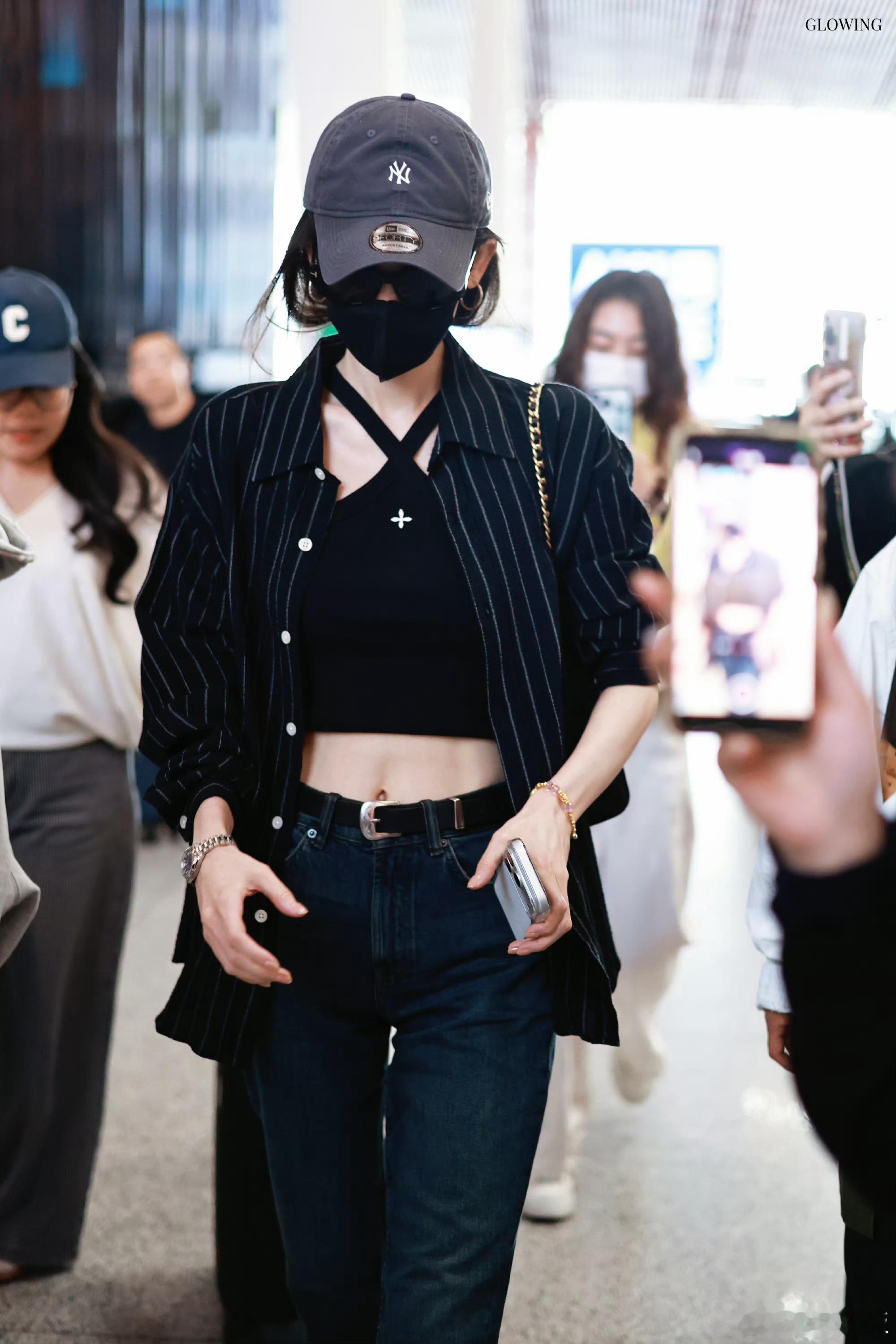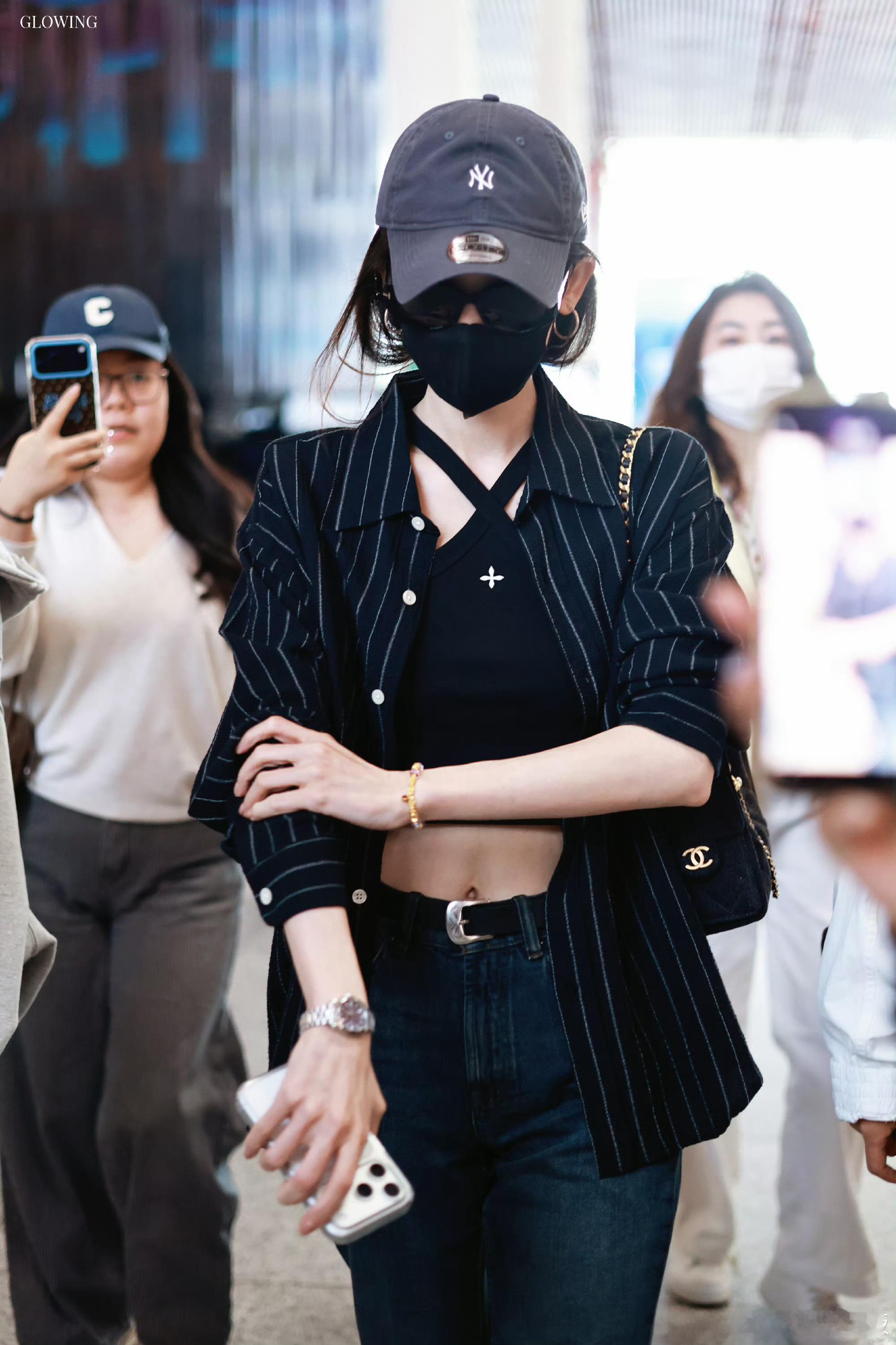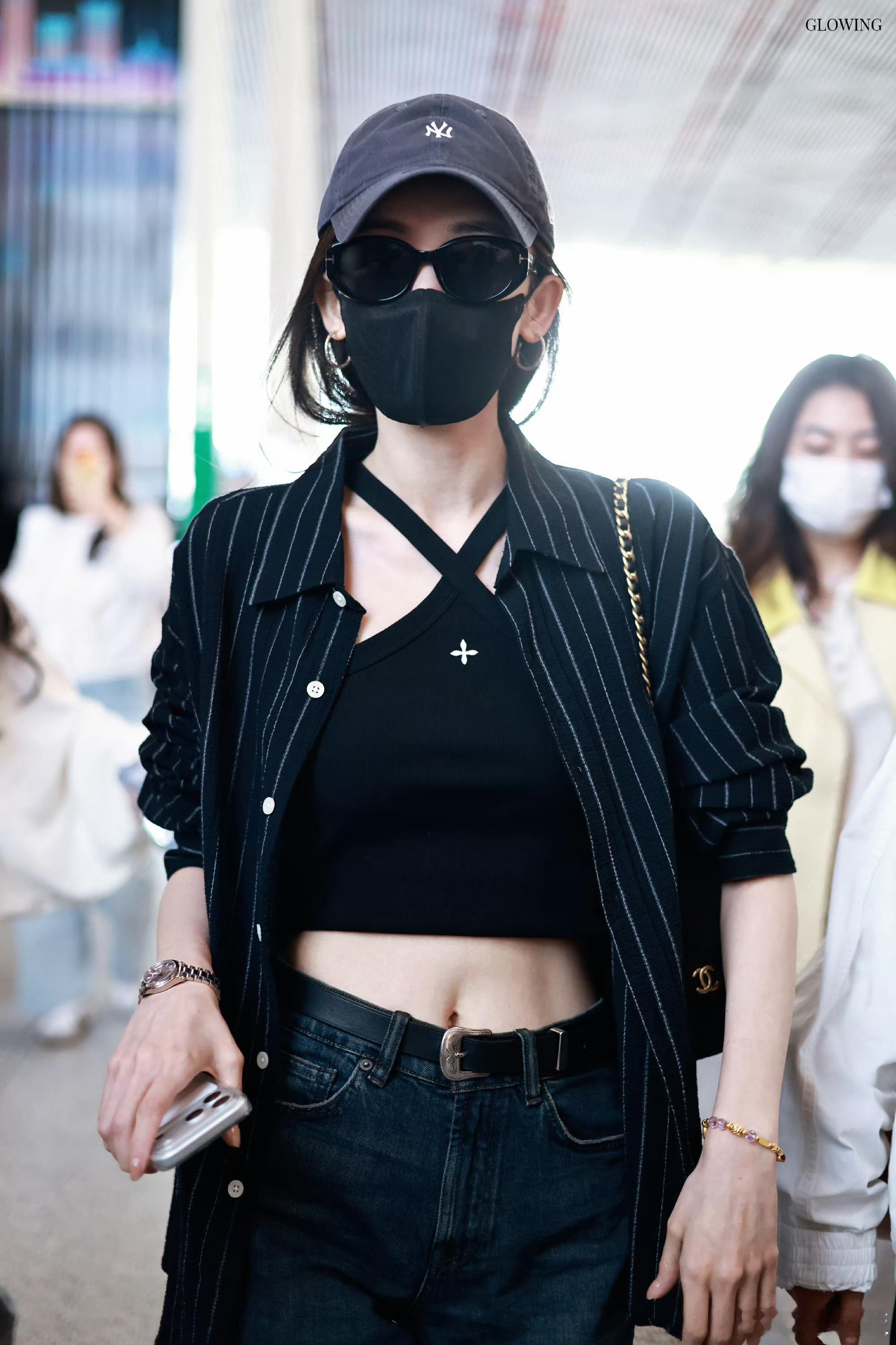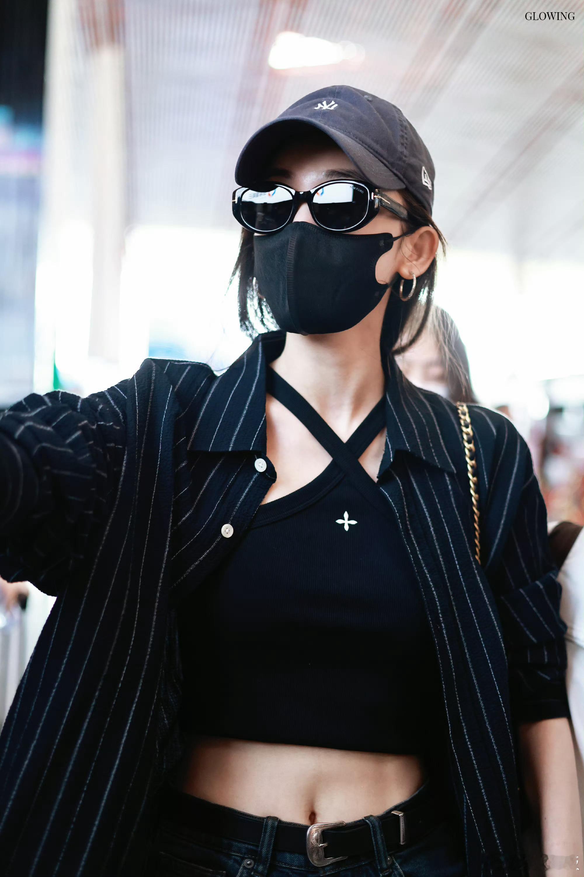 娜扎马甲线 娜扎all black机场造型鲨疯了!短款上衣直接露腰,马甲线线条超绝,又酷又辣的松弛感,谁看了不喊一句姐姐好绝~ cr.水印