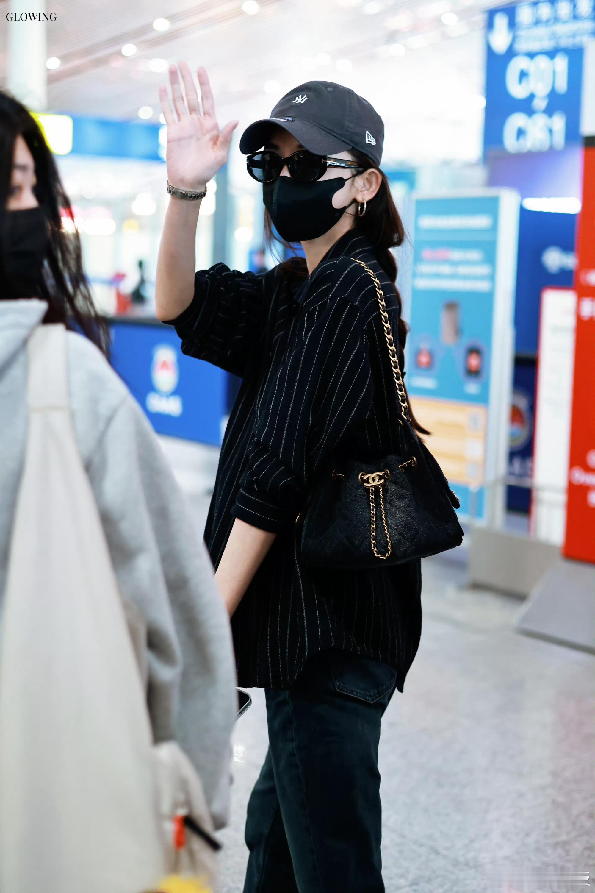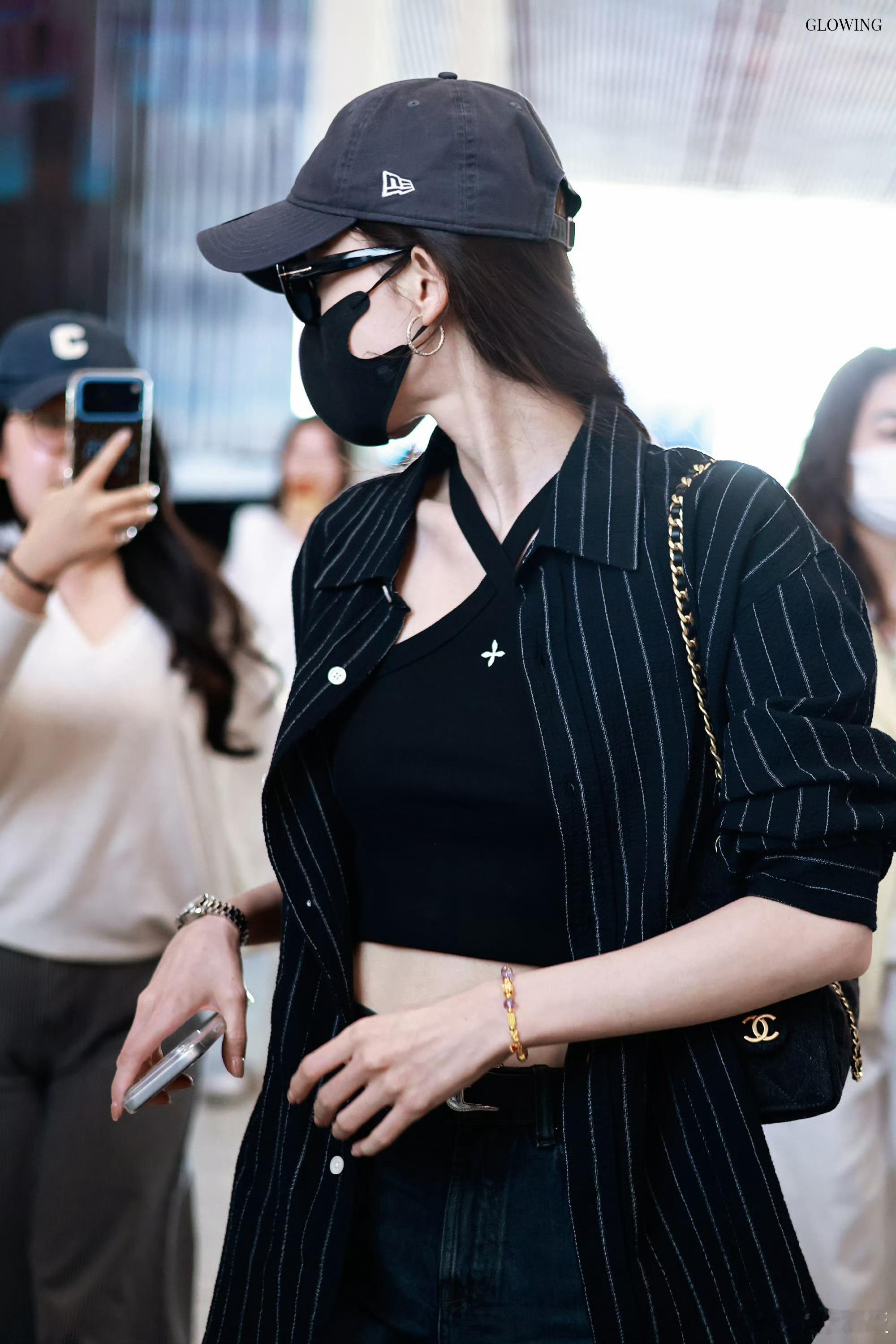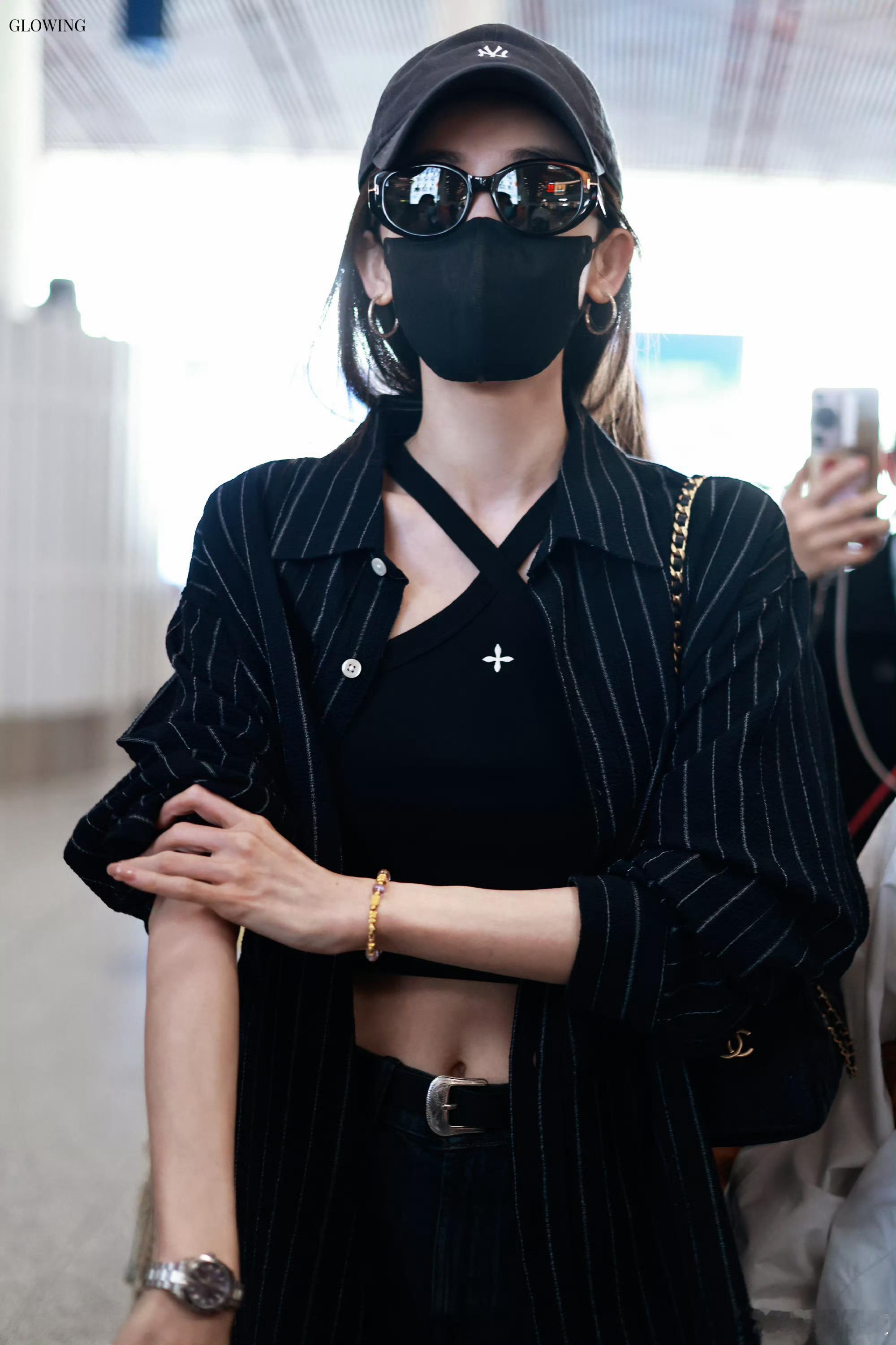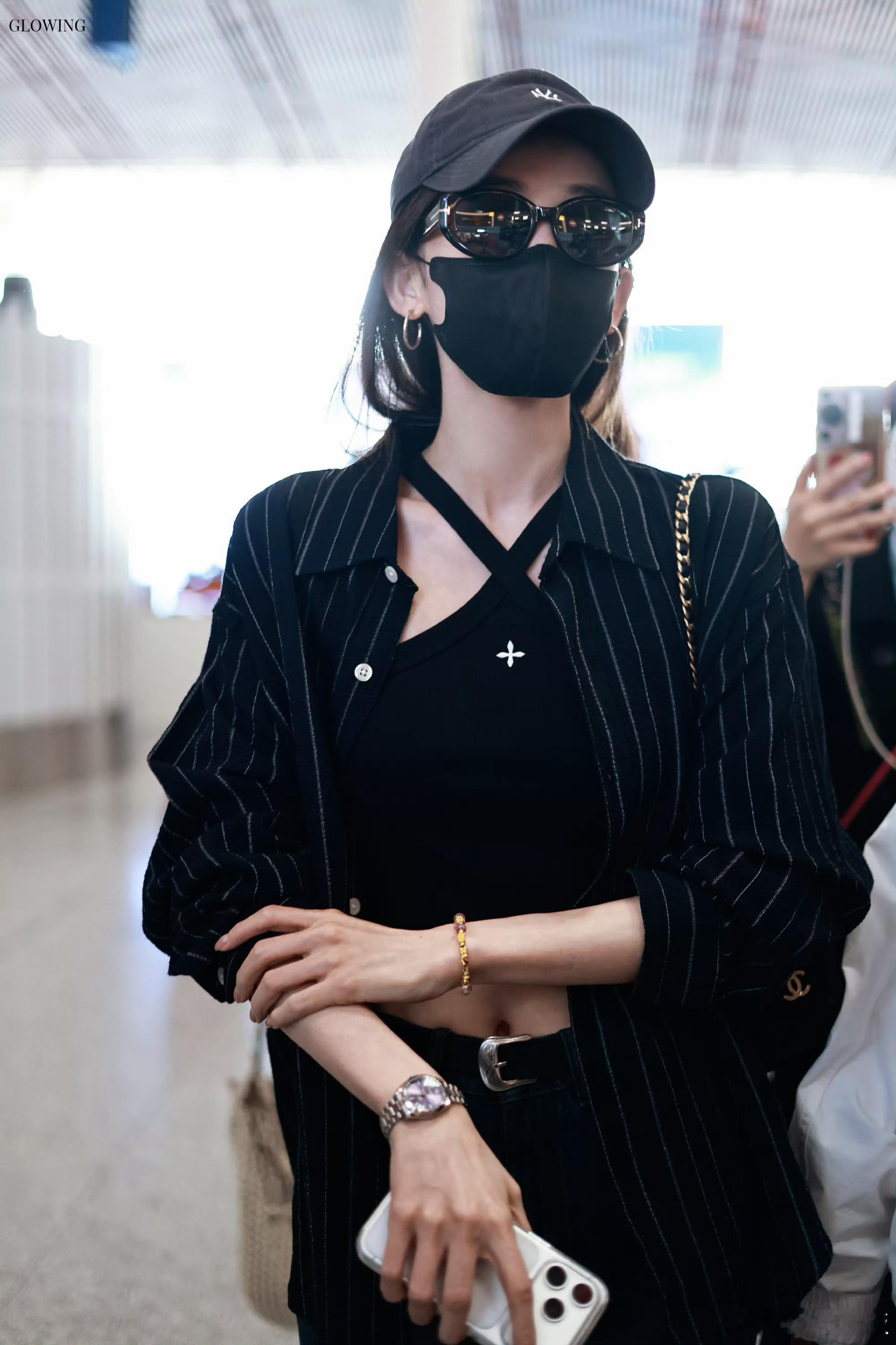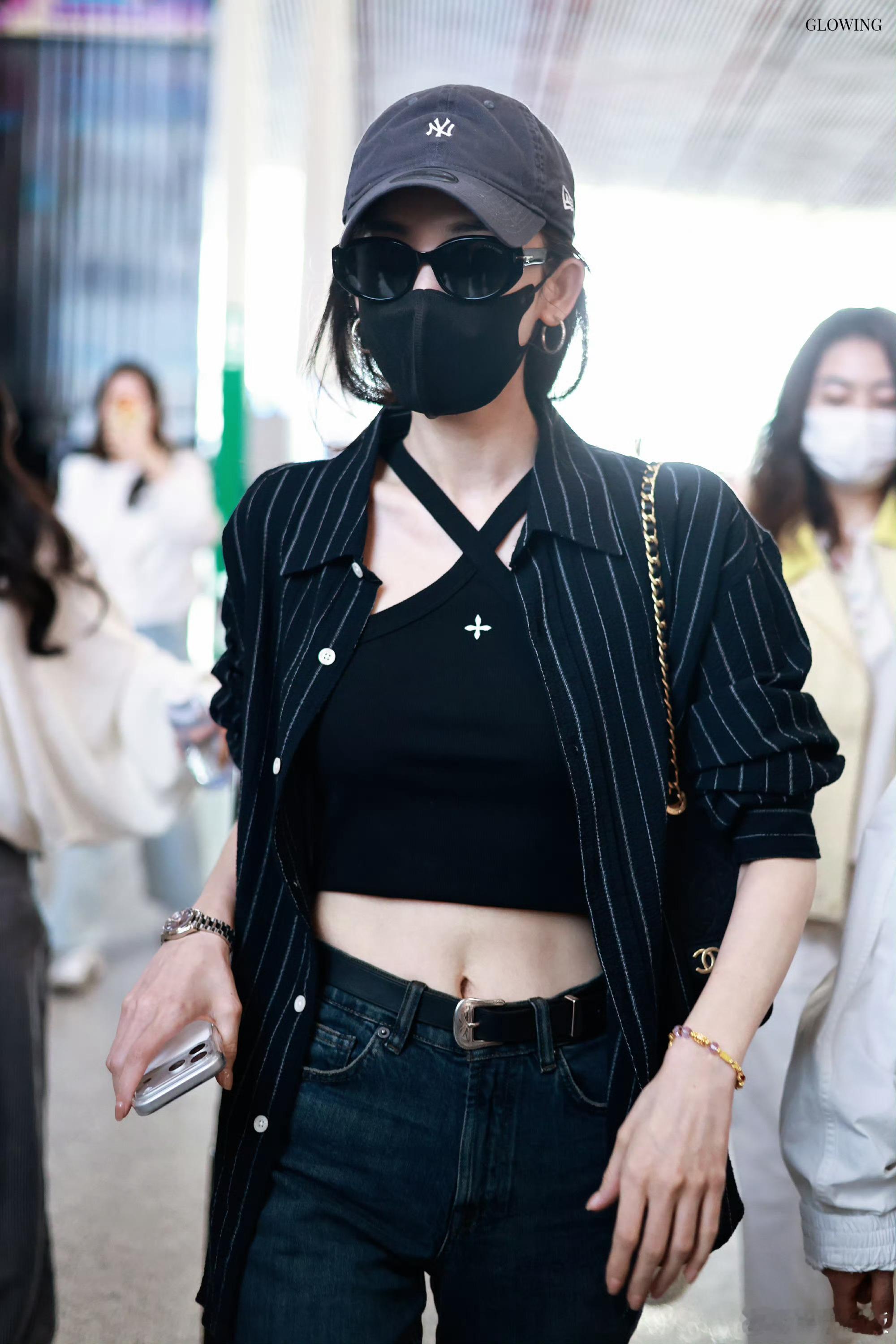娜扎马甲线 娜扎all black机场造型鲨疯了!短款上衣直接露腰,马甲线线条超绝,又酷又辣的松弛感,谁看了不喊一句姐姐好绝~ cr.水印