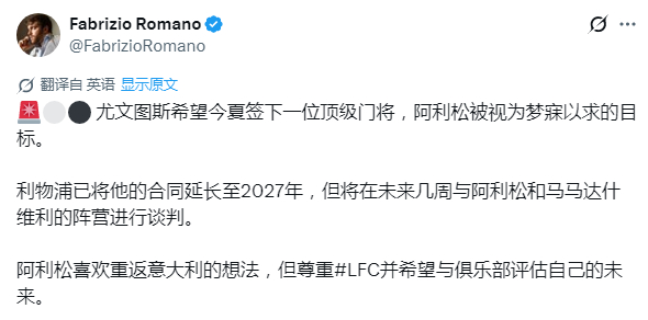 莫雷托:尤文与阿利松之间已经达成初步口头共识。球员本人明确愿意重返意甲,他对尤文图斯的建队计划极具兴趣、十分心动。目前仅剩一个关键问题:利物浦方面对于阿利松离队的态度、转会费要价,以及是否愿意放行。