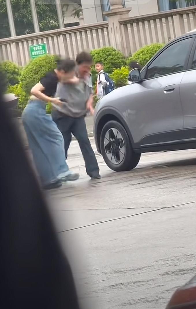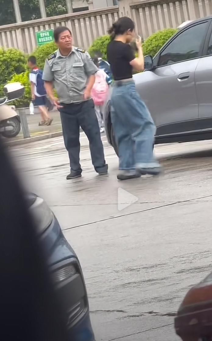 女司机被激怒,下车后情绪失控,脚踹保安,还动手扇其巴掌。保安见此动作,本能地反手重重掌掴她的面部。女司机被打懵,原地冷静了下来。
