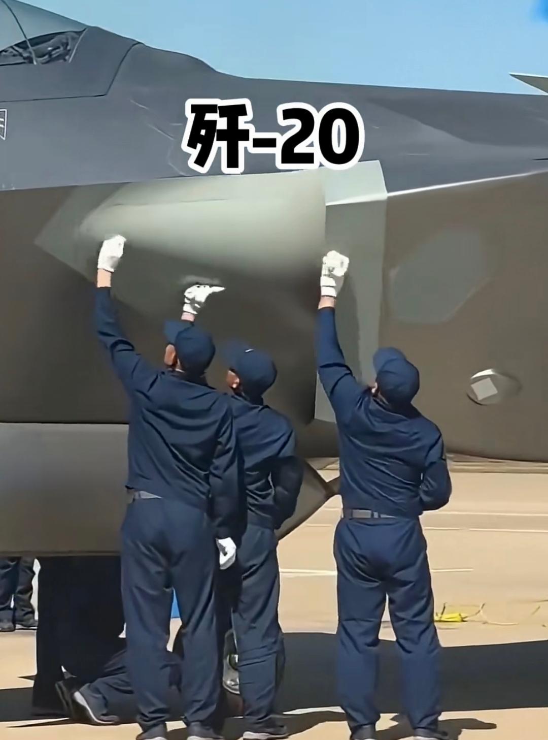 歼-10的机翼上,一大哥抄起拖把,哐哐一顿猛刷。而在歼-20的机身旁,三名地勤小哥戴着白手套,拿着软布小心翼翼地擦拭,连个指纹都舍不得留下。