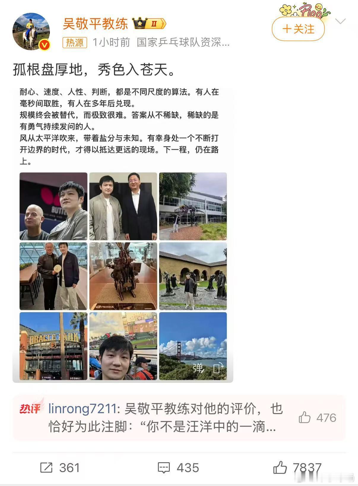 吴敬平用古诗评价樊振东吴敬平以“孤根盘厚地,秀色入苍天”盛赞樊振东。这句诗精准概