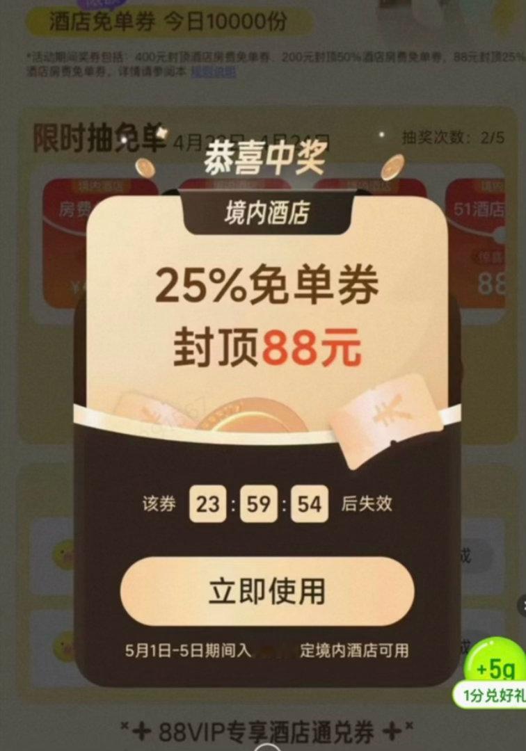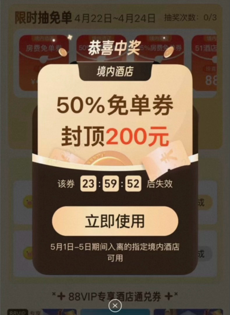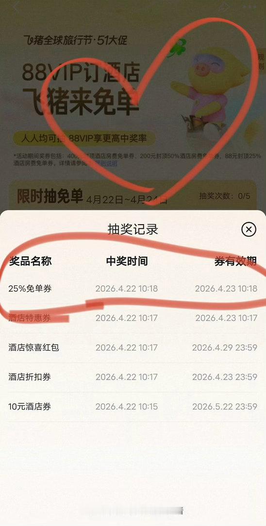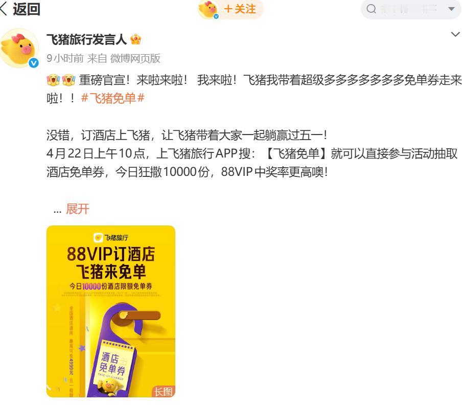 杭州马上放春假了,连着五一假期总共有十天,孩子早就催我看酒店,说想去海边城市玩。看了攻略,准备定网红亲子酒店,刚看到有人晒了张五一酒店免单券,还有这羊毛可以薅,那不是正好嘛。打开看了下飞猪免单活动就开始了,抽奖后再去订酒店便宜多了。打算多抽几次,万一中个免单呢。微博还有两大加码活动,关注参与一下,怎么都能省点钱,有朋友抽中了50%免单,真让人羡慕啊~