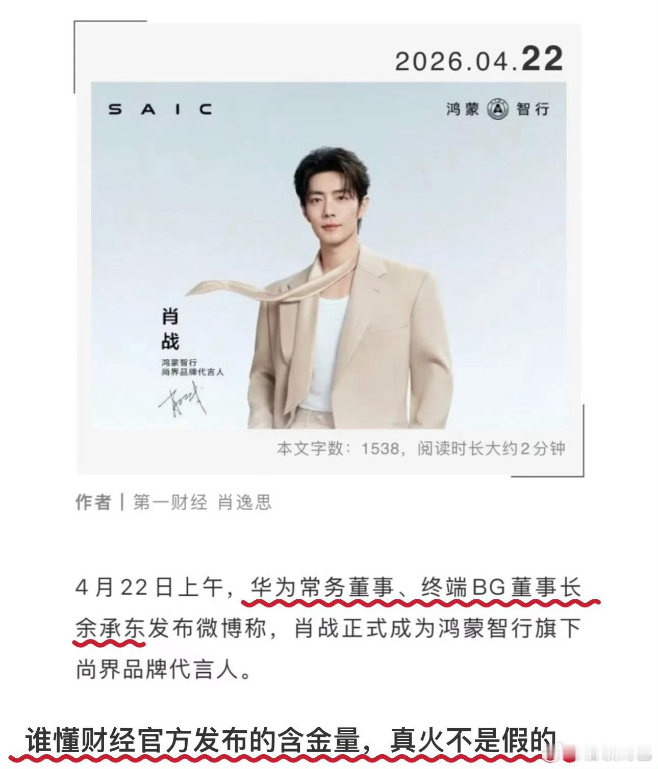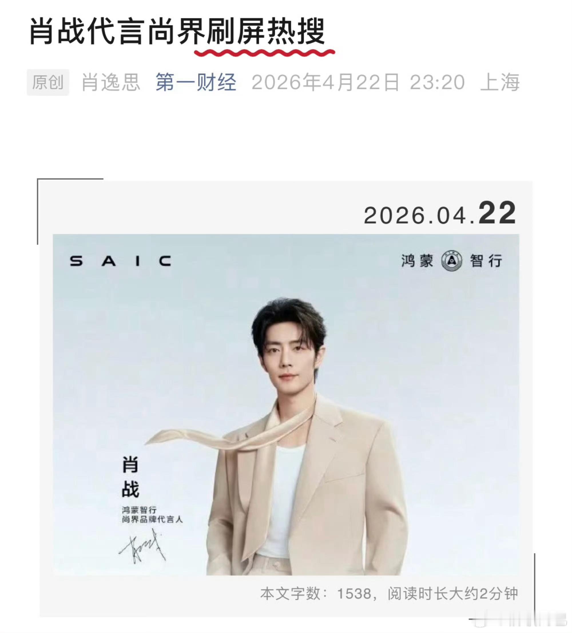 权威财经媒体 《第一财经》在X报道:肖战 × 鸿蒙智行尚界Z7,官宣即引爆市场!