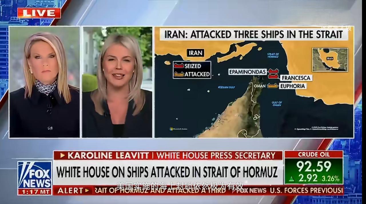 看来伊朗残余政权挺高调的,除此谈判态度,伊方还攻击并扣押了两艘霍尔木兹海峡附近的轮船来表现他们的高调。美方对伊方扣船行为的回应是:我不生气,反正你扣的不是美国的船,谁家的船,谁去着急好了。莱维特讽刺道,伊朗的海军被我们彻底消灭了,所以他们只能干些海盗行径。